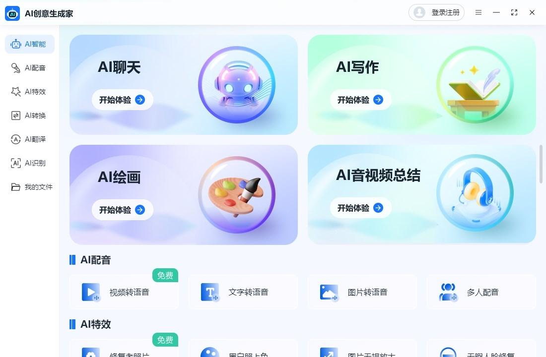 看名字就知道是个非常实用的AI工具,功能齐全,支持AI聊天、AI写作、AI绘画、AI音视频总结,还支持AI配音、AI特效、转换文字、翻译、万能识别。