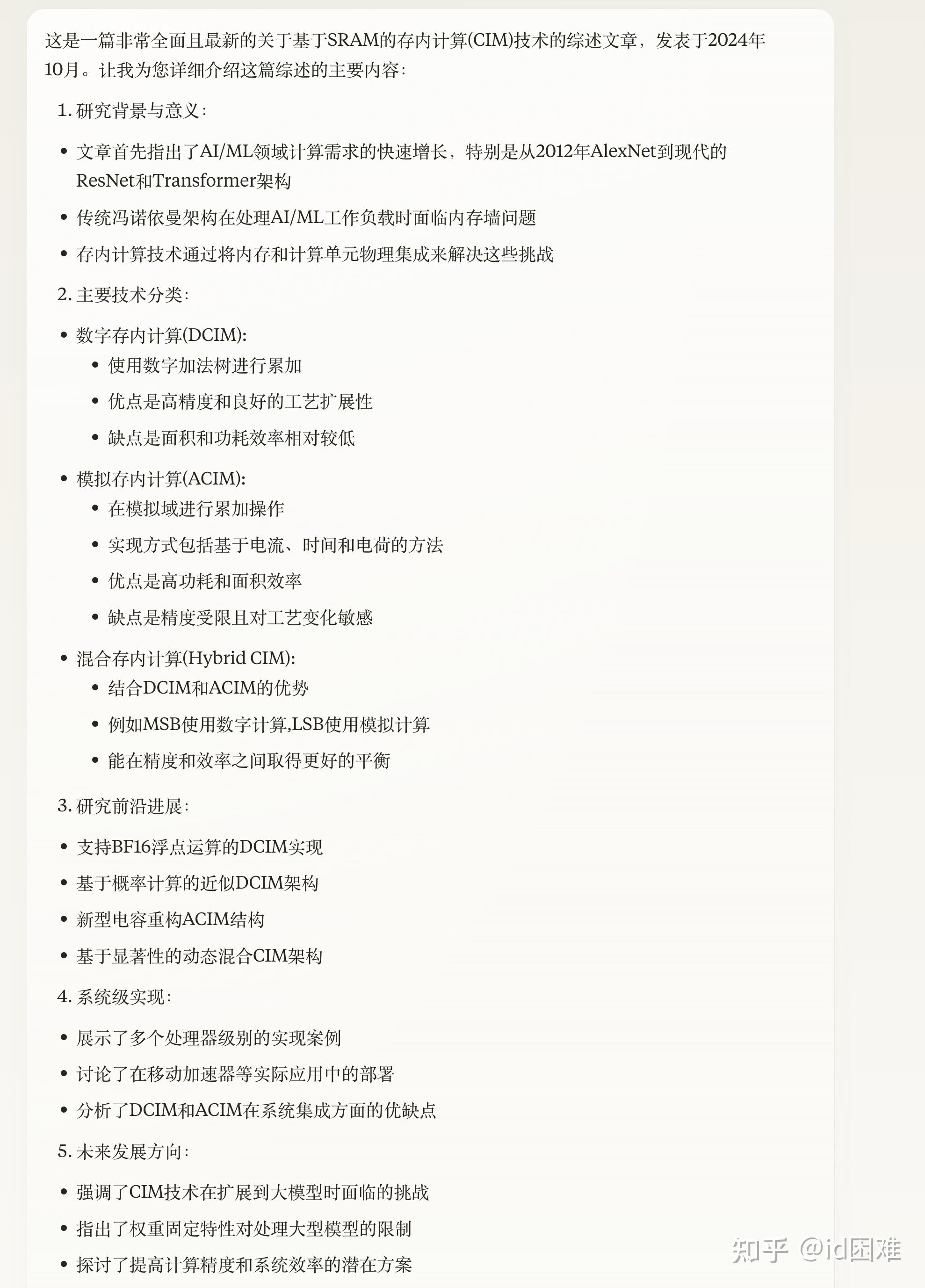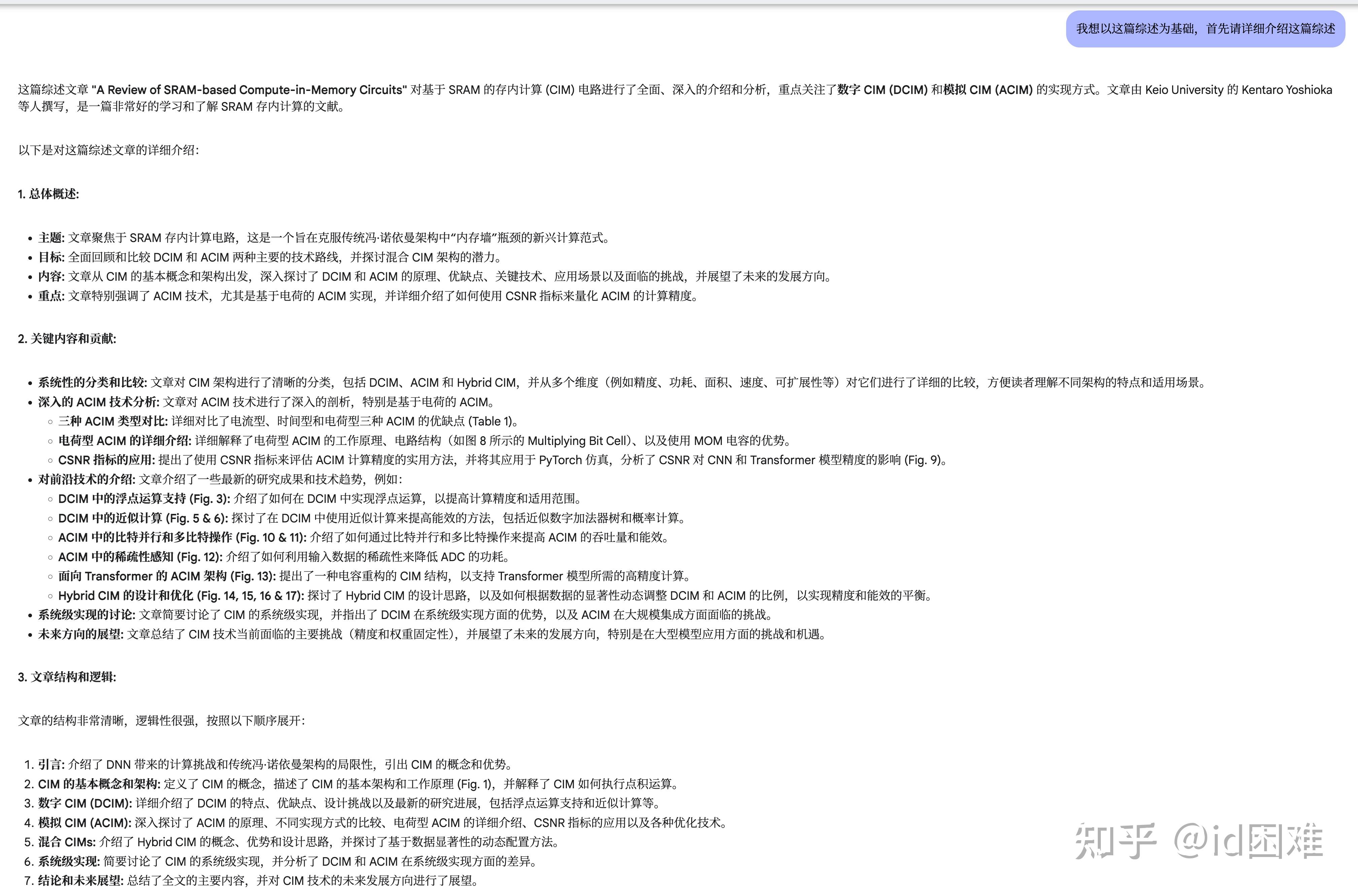 之前写论文我都是用网页端的Claude,但是一写到后面上下文变长输出质量就急剧下降,而且Claude的回答都过于精简,很喜欢进行分点总结,在project的instruction写了也还会这样,基本上一句话一个点,感觉是后训练的时候没训好,或者出于成本考虑在system prompt里面加了输出的要求。比如下面我分别要求Claude和Gemini对于一篇存内计算的综述进行详细的介绍。