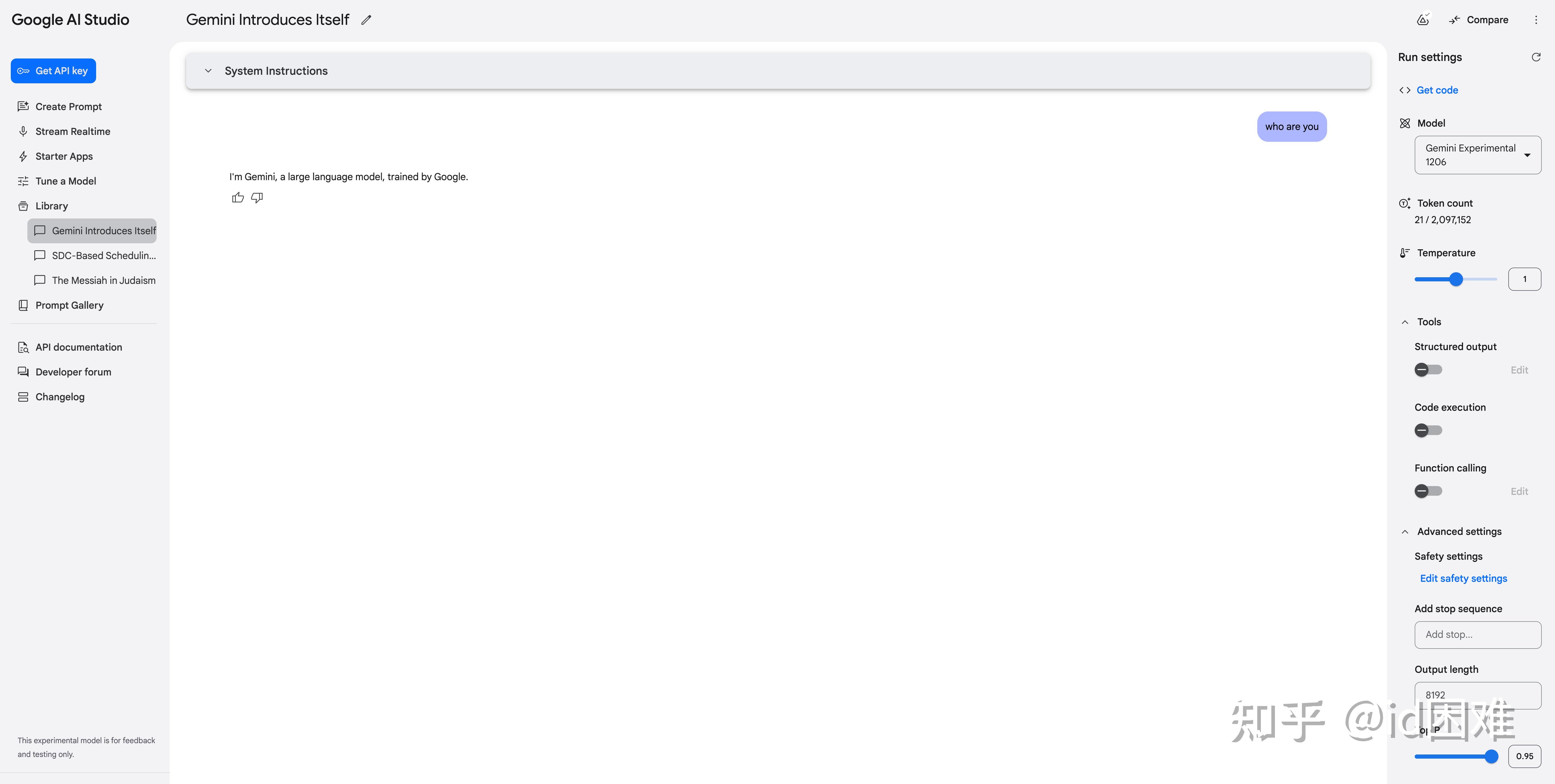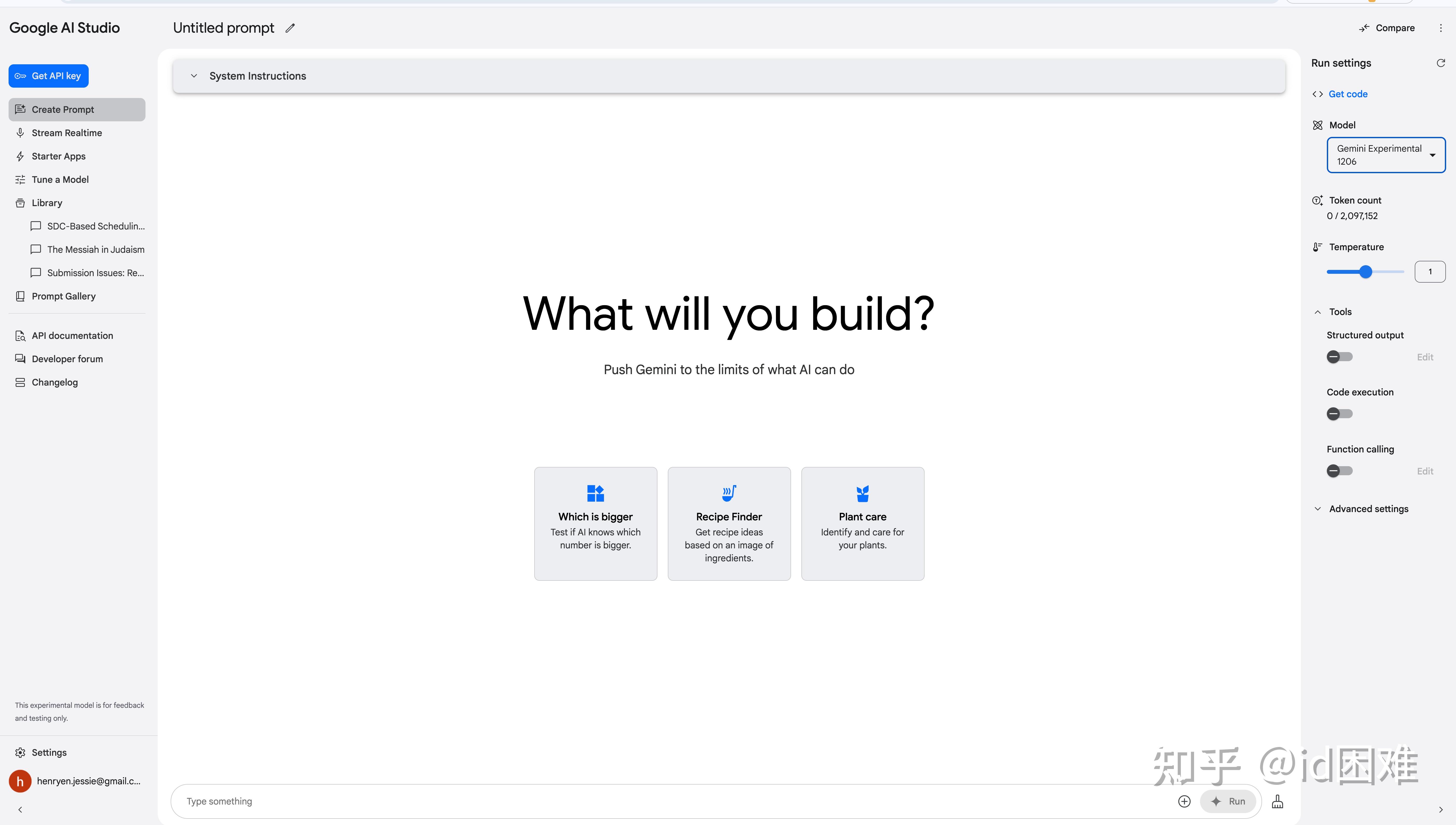 接下来介绍AI Studio的主要使用界面,首先是左侧的Create Prompt,相当于新建对话,但要注意这里的历史记录并不会自动保存,它需要通过右上角的Save to Disk保存到Google云盘中,为了方便可以在设置中打开自动保存。历史会保存到左侧的Library中。从这里可以看出来它的本意是让你测试不同的User Prompt和System Prompt效果有什么区别。