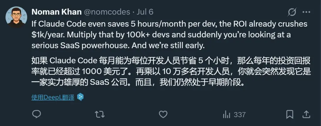 按照这个算法,每个开发者平均每年将向 Clade Code 贡献超过 1000 美元。这比很多个人订阅服务都高得多,意味着用户群体中存在大量高价值、高粘性的付费用户。