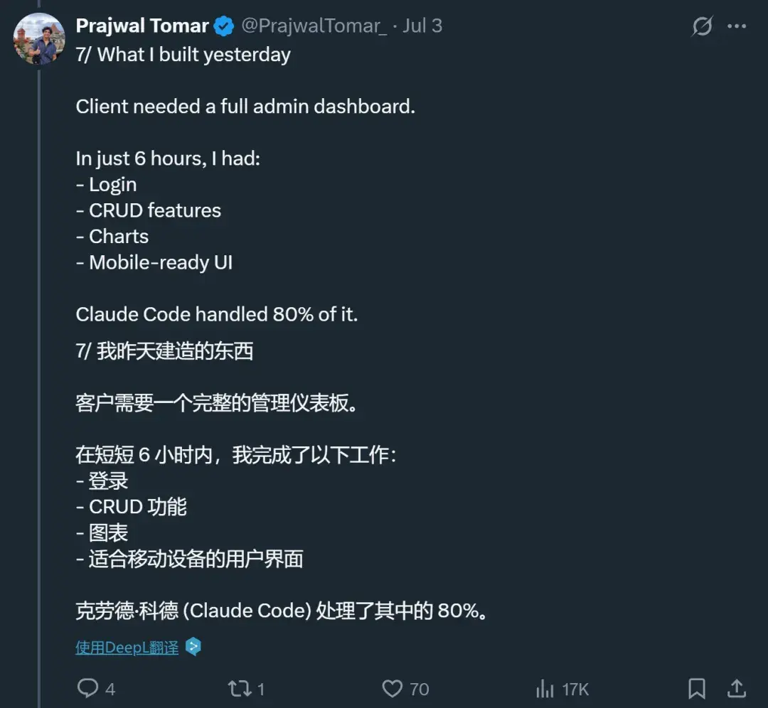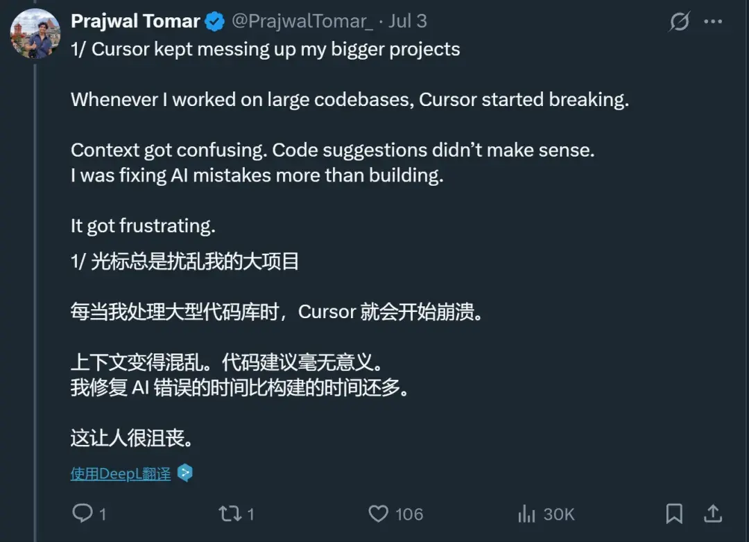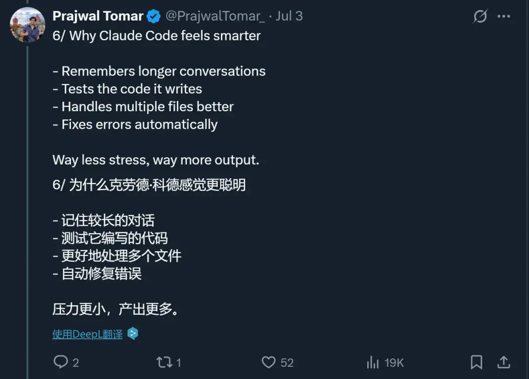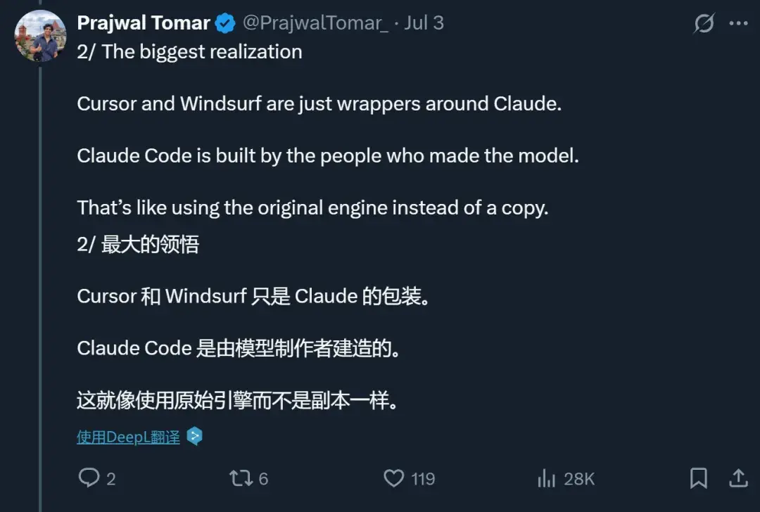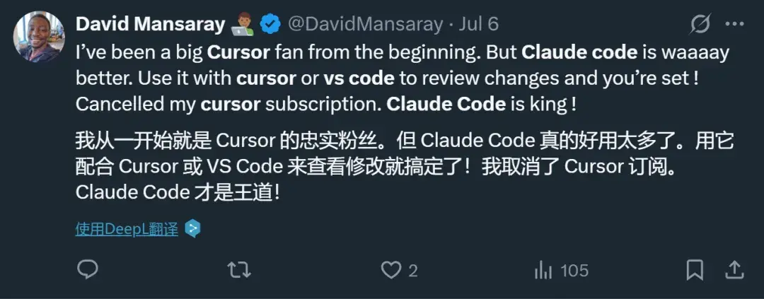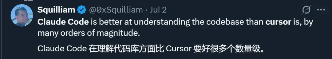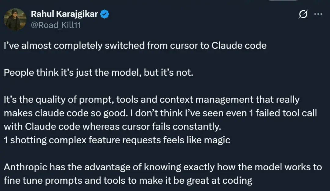 甚至一些之前用 Cursor 的开发者也在转向 Claude Code,原因包括:Claude Code 对于代码库的理解、工具的调用以及上下文的管理都更为出色,使用体验更好。