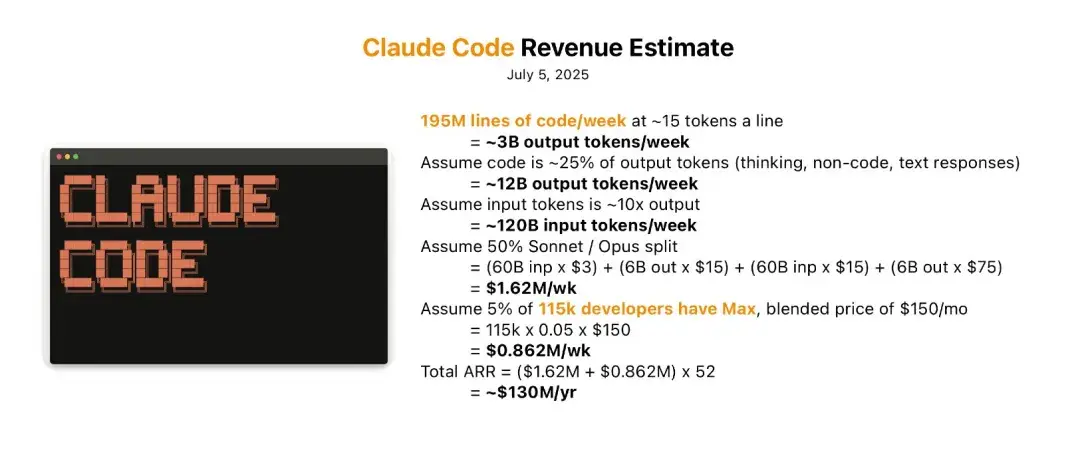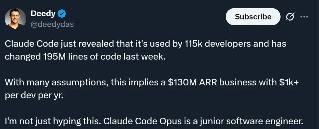 Menlo Ventures 风险投资家 Deedy Das 据此推断,仅靠 Claude Code 这个产品,Anthropic 的年收入就可能达到 1.3 亿美元。