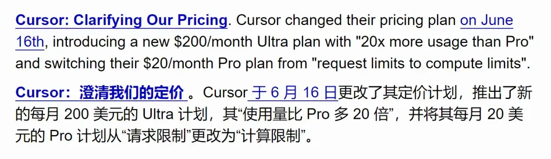 在调整定价策略前,Cursor 的 Pro 订阅每月收费 20 美元,提供每月最多 500 次请求的限制,用户可以使用任何模型进行请求。由于是按请求次数收费,一些用户可能通过这宝贵的 500 个请求中的每一个发送大量 token。调整后,原有的基于请求次数的限制改为基于计算量(token 消耗)的限制。用户每月有 20 美元的预算用于 token 消耗,超出部分将按照实际使用量收费。同时,Cursor 还新增了每月 200 美元的 Ultra 计划,此计划与 Claude code 的 Max 计划收费相当。