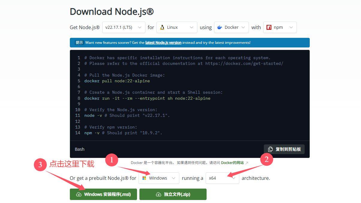 访问 Node.js 官网 下载对应操作系统的安装包,按默认完成安装,安装后在终端输入 node -v 验证安装。