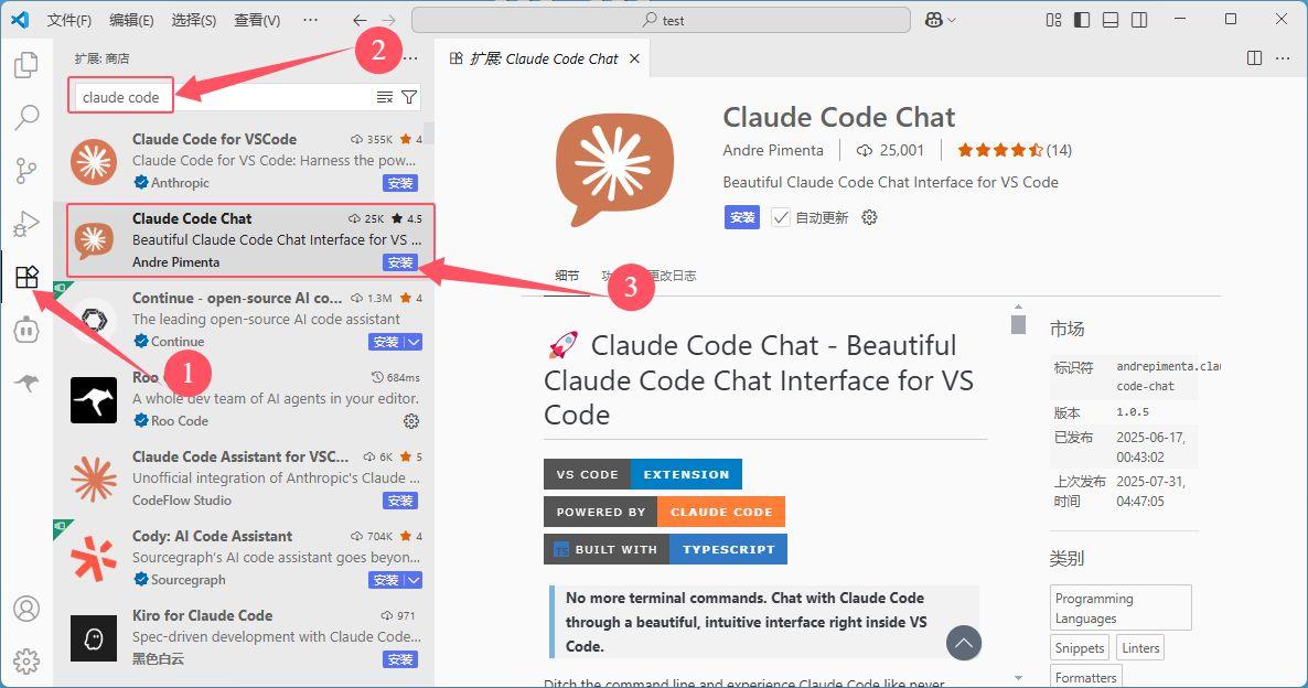 对于不习惯命令行的开发者:可以打开 VS Code 扩展商店,安装并启用 “Claude Code Chat” 这款扩展插件,即可获得类似 Cursor 的图形化编程体验