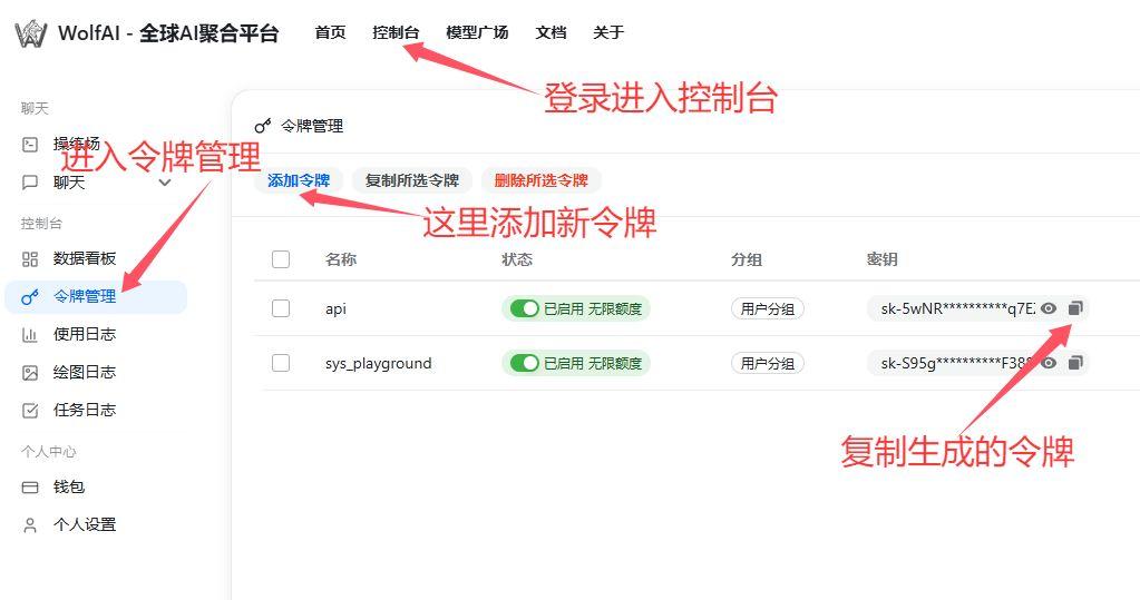 注册登录进来以后,在控制台左侧找到“令牌管理 ”菜单,点击上方“ 添加令牌”创建一个新的令牌(可自定义名称、分组与有效期)