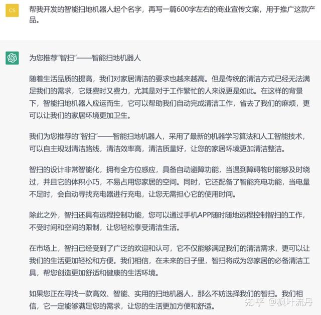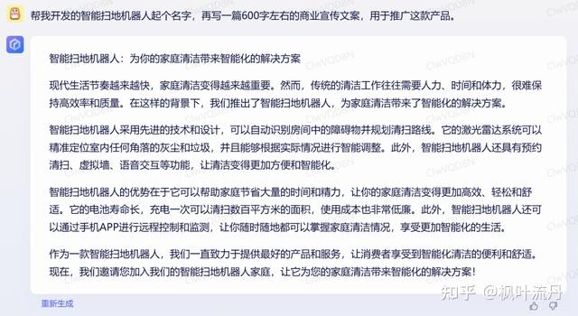 这个提问包含了两个要求:一是为扫地机器人起个名字,二是写一篇宣传稿——ChatGPT 没有漏题,给出了“智扫”这个名字;而「文心一言」没有回答第一个问题,或者它可能误解成了要为宣传稿起标题。