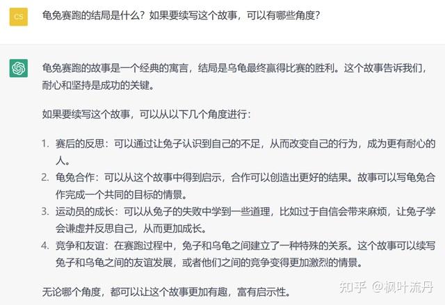 从结果可以看出,「文心一言」和 ChatGPT 都进行了正确回答,不同之处在于「文心一言」对故事整体概述了一遍,解释了乌龟赢得比赛的原因。在故事的续写上,二者给出的角度也不分伯仲,而「文心一言」更是对每个续写角度都给出了相应的寓意解释。