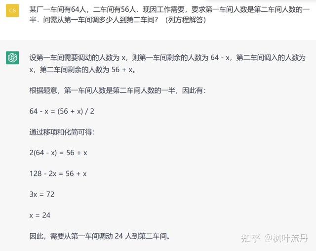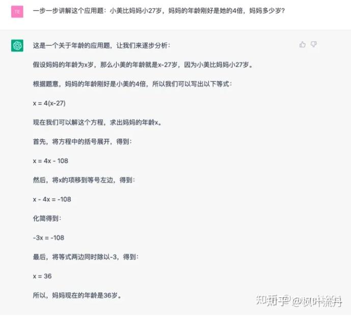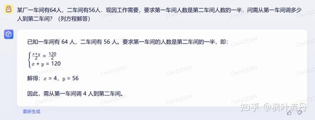 这道应用题源自初中数学题库,是一元一次方程常考的题型之一。从生成结果来看,ChatGPT 给出了正确答案并附有详细解题步骤,而「文心一言」可能在题意理解上还有待改善。