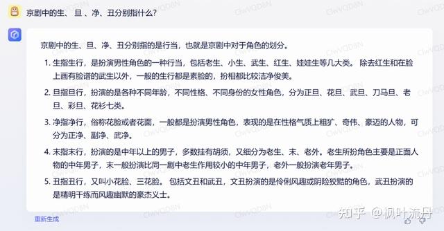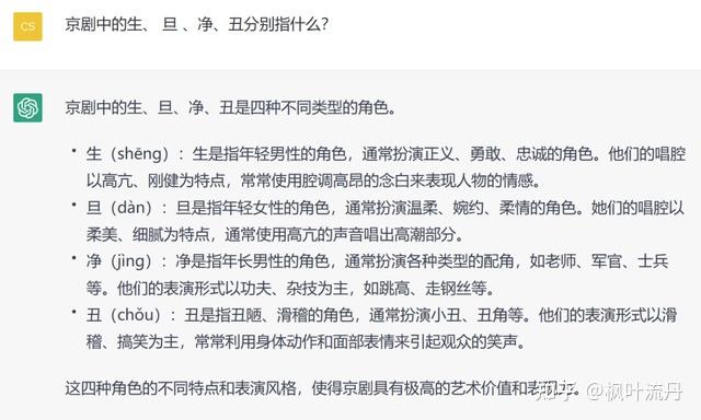 百度称「文心一言」具备中文领域最先进的自然语言处理能力,从它对京剧生、 旦 、净、丑的理解来看,水平还不错,还多回答了一个题目中没问的“末”。ChatGPT 的回答乍看之下也挺好,但细看之后,净行居然要“跳高、走钢丝”?