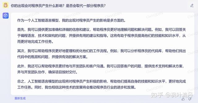 在这个问题中,虽然「文心一言」没有回答“是否会取代一部分程序员”,但它对程序员的影响分析得较为全面;ChatGPT 明确回答了“不会取代程序员”,对程序员的影响也进行了简要说明。