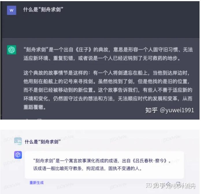 在知识问答方面,【chatgpt】给出了错误答案,而【文心一言】则给出了正确答案。“刻舟求剑”应该出自《吕氏春秋·察今》。