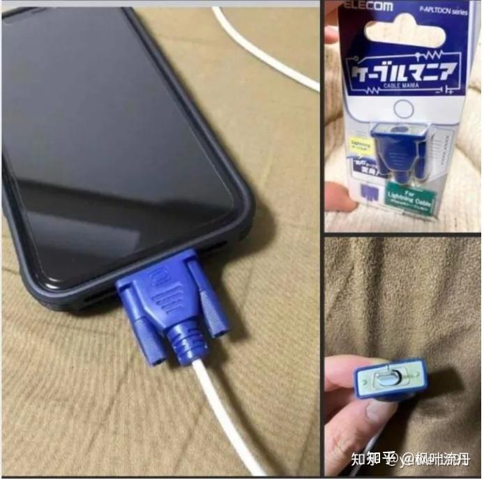 这张图片的幽默感来自于将一个大的、过时的 VGA 连接器插入一个小的、现代的智能手机充电端口的荒谬性。