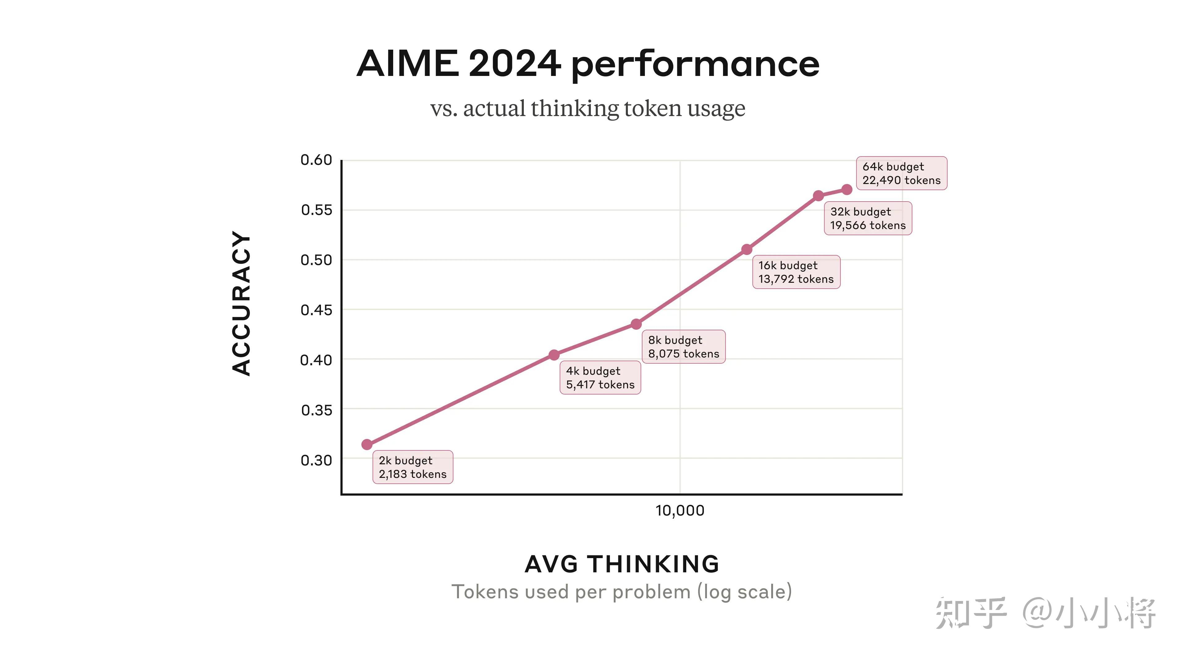 Claude 3.7 Sonnet的推理也符合test-time compute scaling law,这意味着增加思考的tokens可以提升性能,但也更慢。所以通过控制预算能够在速度(和成本)与回答质量之间进行权衡。