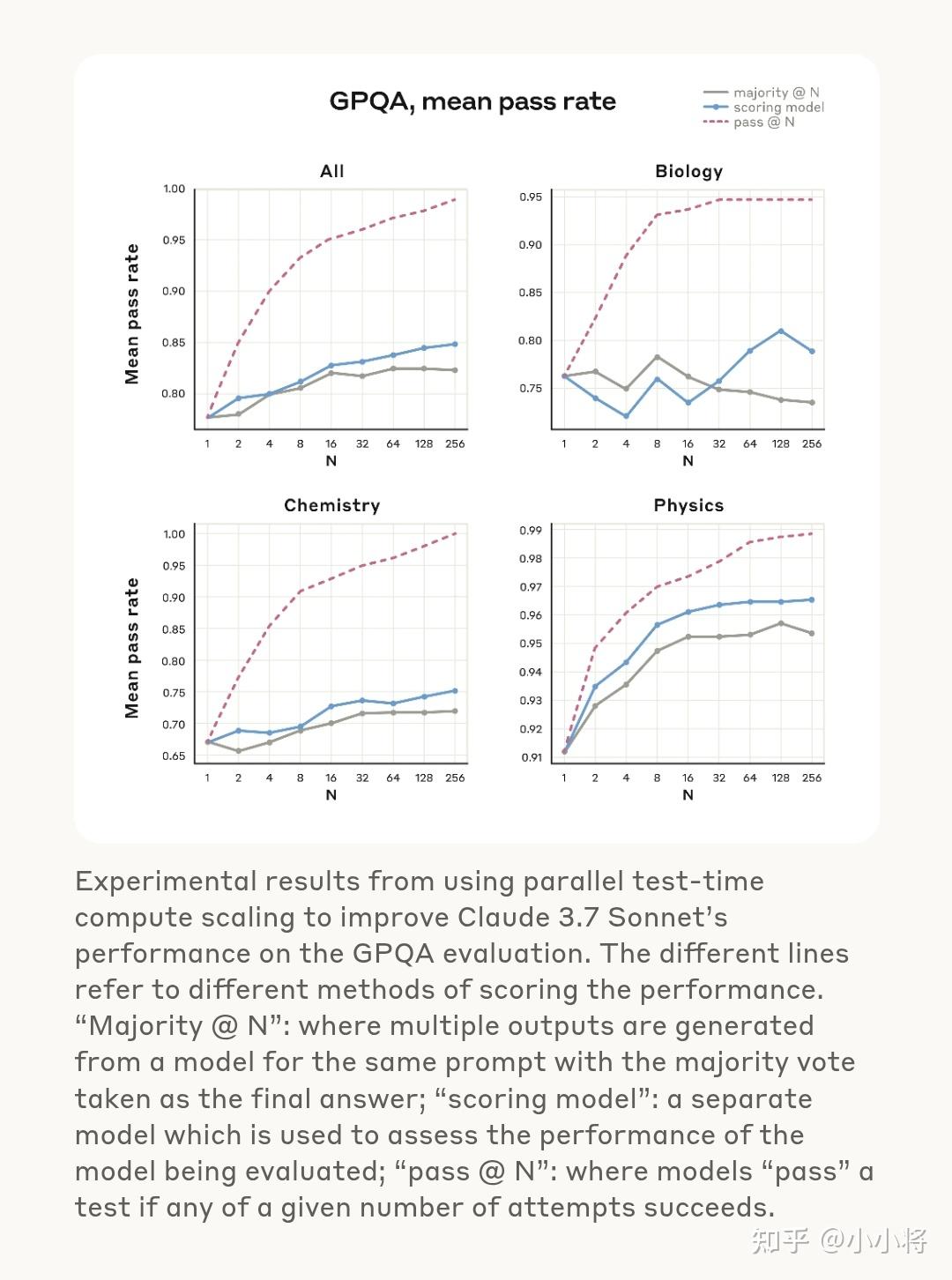 这里GPQA有两个结果,第二个结果是通过parallel test-time compute scaling来得到的,简单来说就是先同样的提示词采样多个回答,然后用一个打分模型选择最好的。和majority vote的区别是这里用一个学习过的打分模型来选择,而majority vote则选择出现次数最大的那个答案。实验看起来用打分模型比简单的majority vote要好。采样同算力的256个回答,限制最大64K的思考tokens,使用基于打分模型的parallel test-time compute scaling,Claude 3.7 Sonnet在GPQA上得分84.8%。