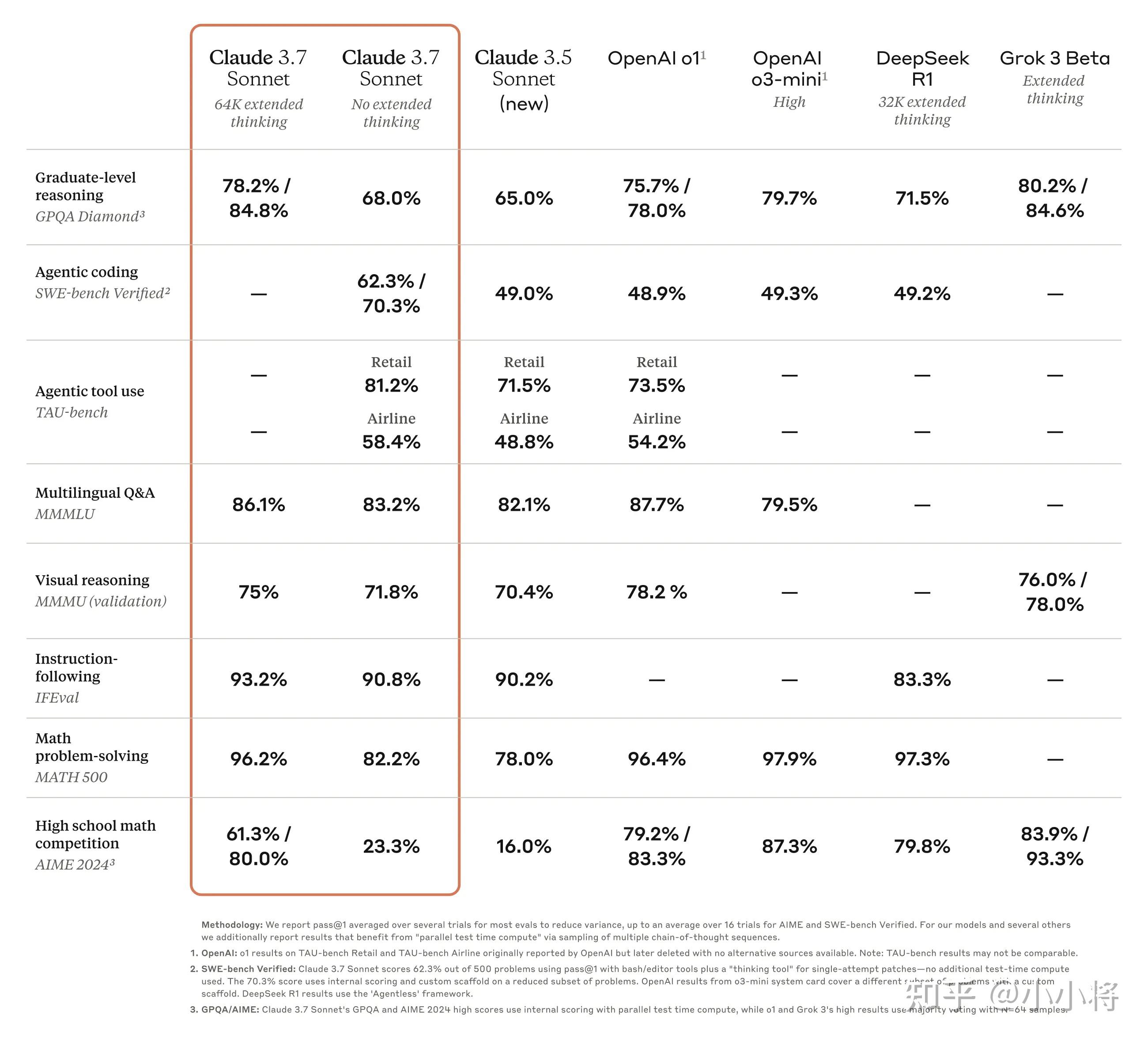 Claude 3.7 Sonnet的更多评测结果如下所示,可以看到在开启扩展思考模式下,部分指标已经超过o3-mini以及DeepSeek R1,但是不强于Grok 3。不过在数学竞赛评测集上,效果要比o3-mini和DeepSeek R1差一些,这可能是前面所提到的:Claude 3.7 Sonnet训练过程中刻意减少了对数学竞赛问题的优化。