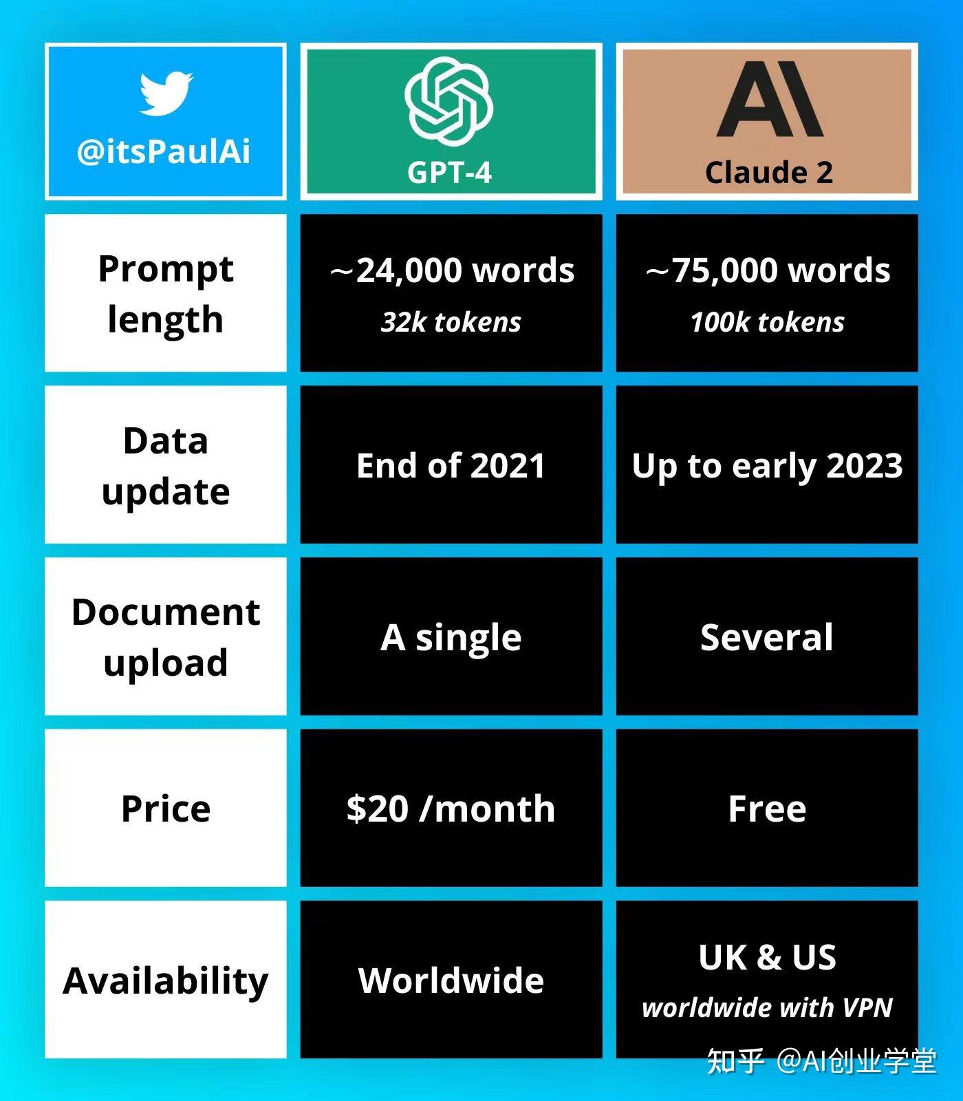 分享一个Chat Gpt与Claude 2的对比图: