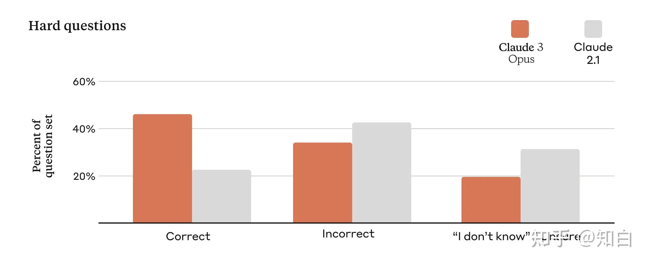 各种规模的企业都依赖我们的模型来为他们的客户提供服务,因此我们的模型输出必须保持大规模的高精度。为了评估这一点,我们使用了大量复杂的事实问题,这些问题针对当前模型中的已知弱点。我们将回答分为正确答案、错误答案(或幻觉)和承认不确定性,其中模型说它不知道答案,而不是提供不正确的信息。与 Claude 2.1 相比,Opus 在这些具有挑战性的开放式问题的准确性(或正确答案)方面提高了两倍,同时也减少了错误答案的水平。