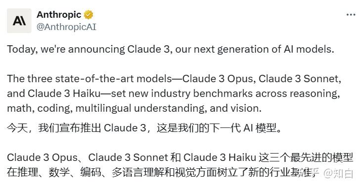 就在刚刚,Claude 官方正式宣布推出下一代 AI 模型 Claude 3,包含了 Claude 3 Opus、Claude 3 Sonnet 和 Claude 3 Haiku 这三个最先进的模型在推理、数学、编码、多语言理解和视觉方面树立了新的行业基准。