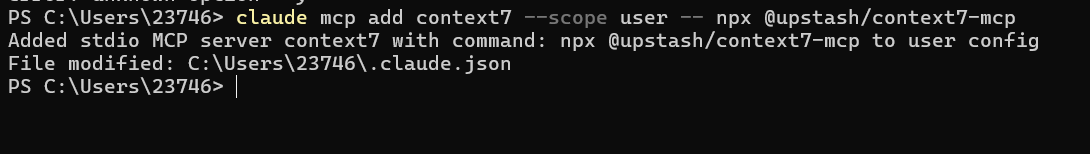 讯享网claude mcp add context7 –scope user – npx @upstash/context7-mcp –api-key YOUR_API_KEY