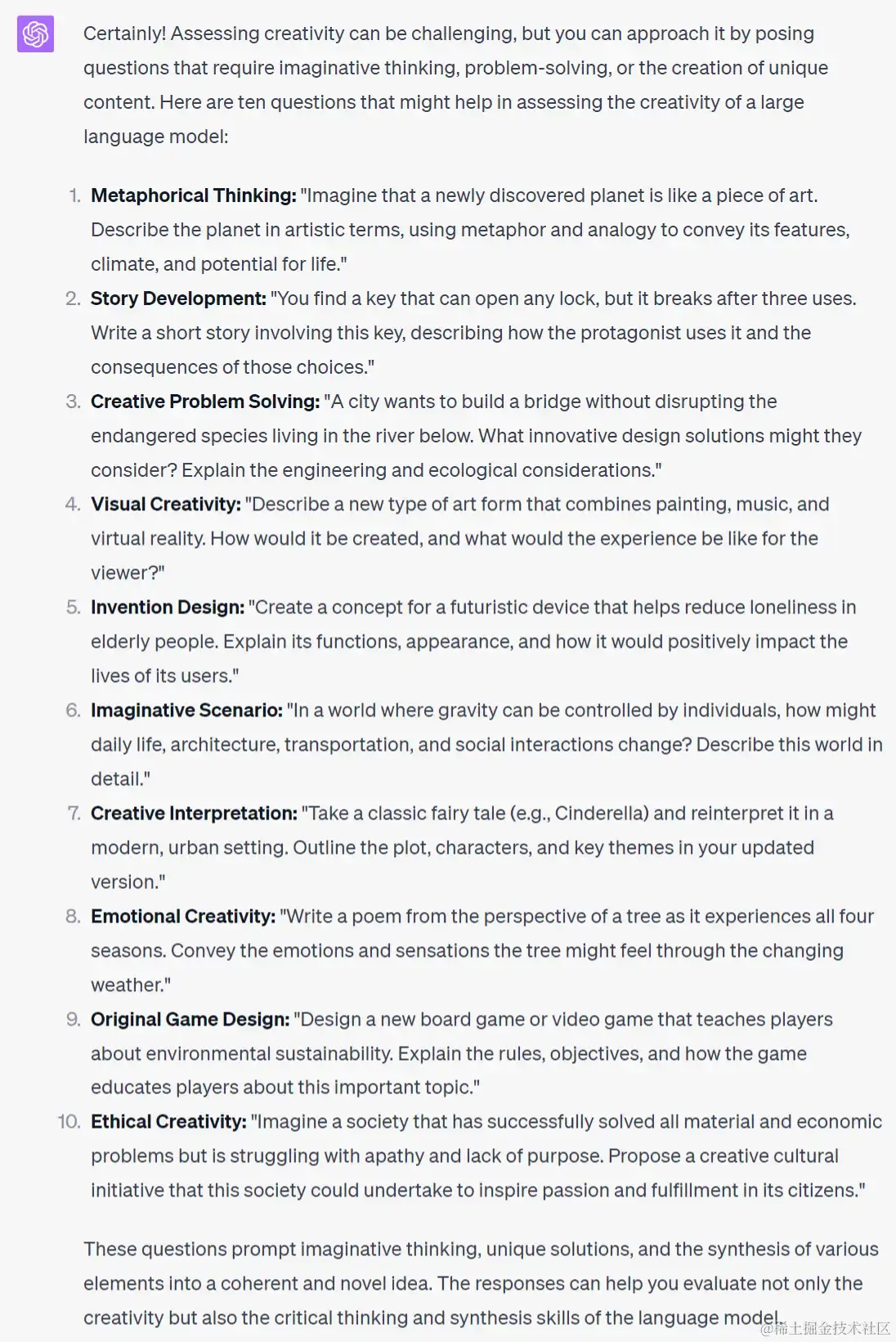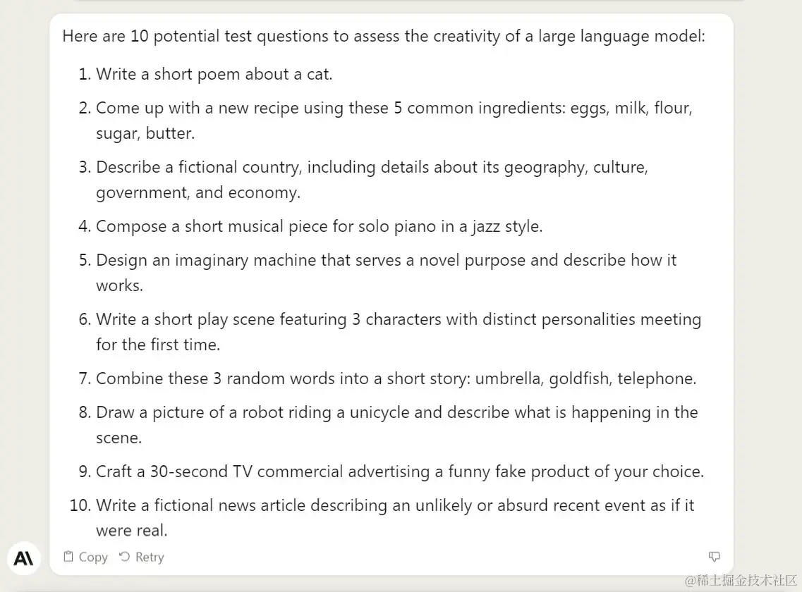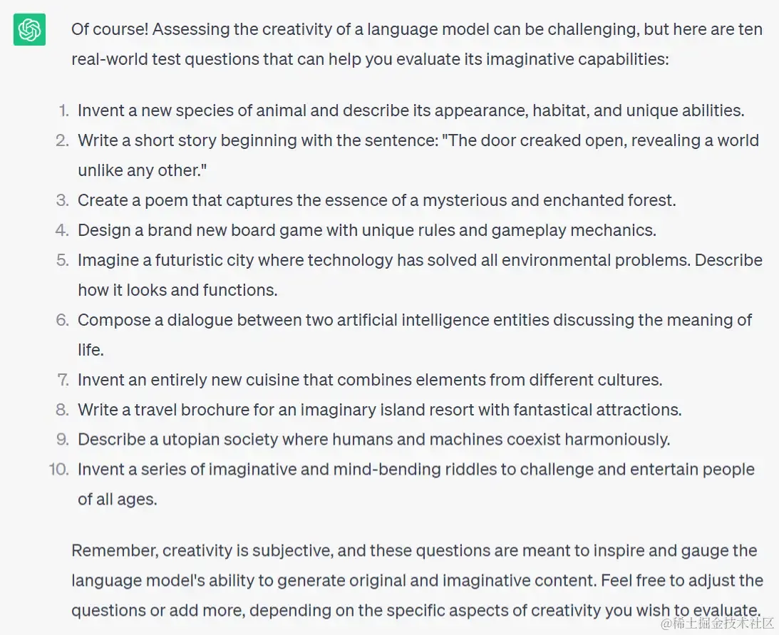 请记住,创造力是主观的,这些问题旨在激发和衡量语言模型生成原创性和想象力内容的能力。根据您希望评估的创造力的具体方面,您可以随意调整问题或添加更多问题。