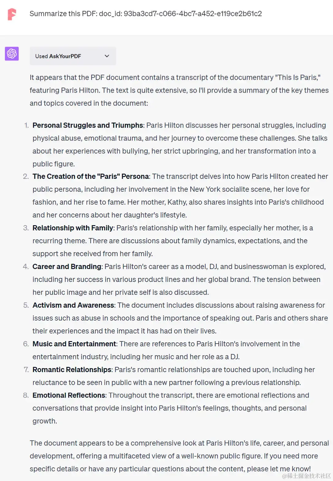 我在之前的文章中,用 ChatGPT 结合 VoxScipt 插件总结了一个帕丽斯·希尔顿纪录片的长达2万4千个单词的视频文稿。