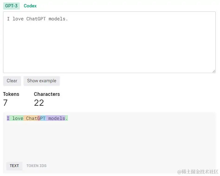 人们经常会用字符数或者单词数/字数来统计文本的长度。但像 ChatGPT 这样的大语言模型却不是这样计算的。它使用 Token 作为读取的文本单元。如果要分析这句话:"I love ChatGPT models.",ChatGPT会把它分解为 "I", "love", "Chat", "G", "PT", "models", "." 这 7 个 Token,如下图所示,甚至一个句号都作为一个 Token。