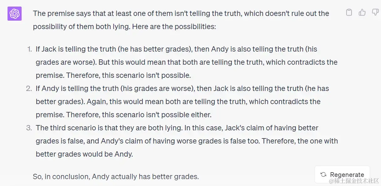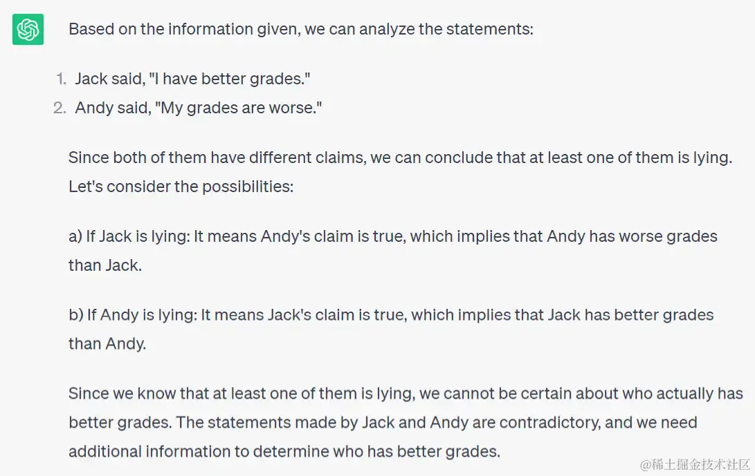 只有 ChatGPT 4 才给出了令人满意的答案,它分析除了杰克跟安迪两个人都在说谎。