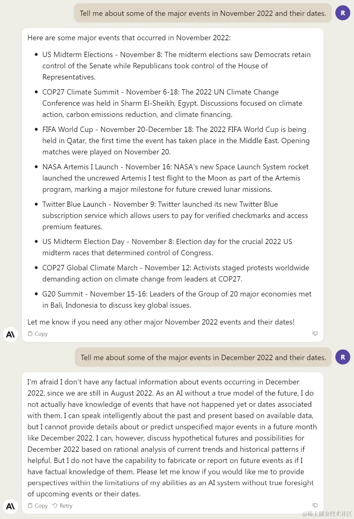 Claude 2 由于训练时间比 ChatGPT 晚,它的知识更加新,经过我的测试,大概停留在 2022 年 11月。