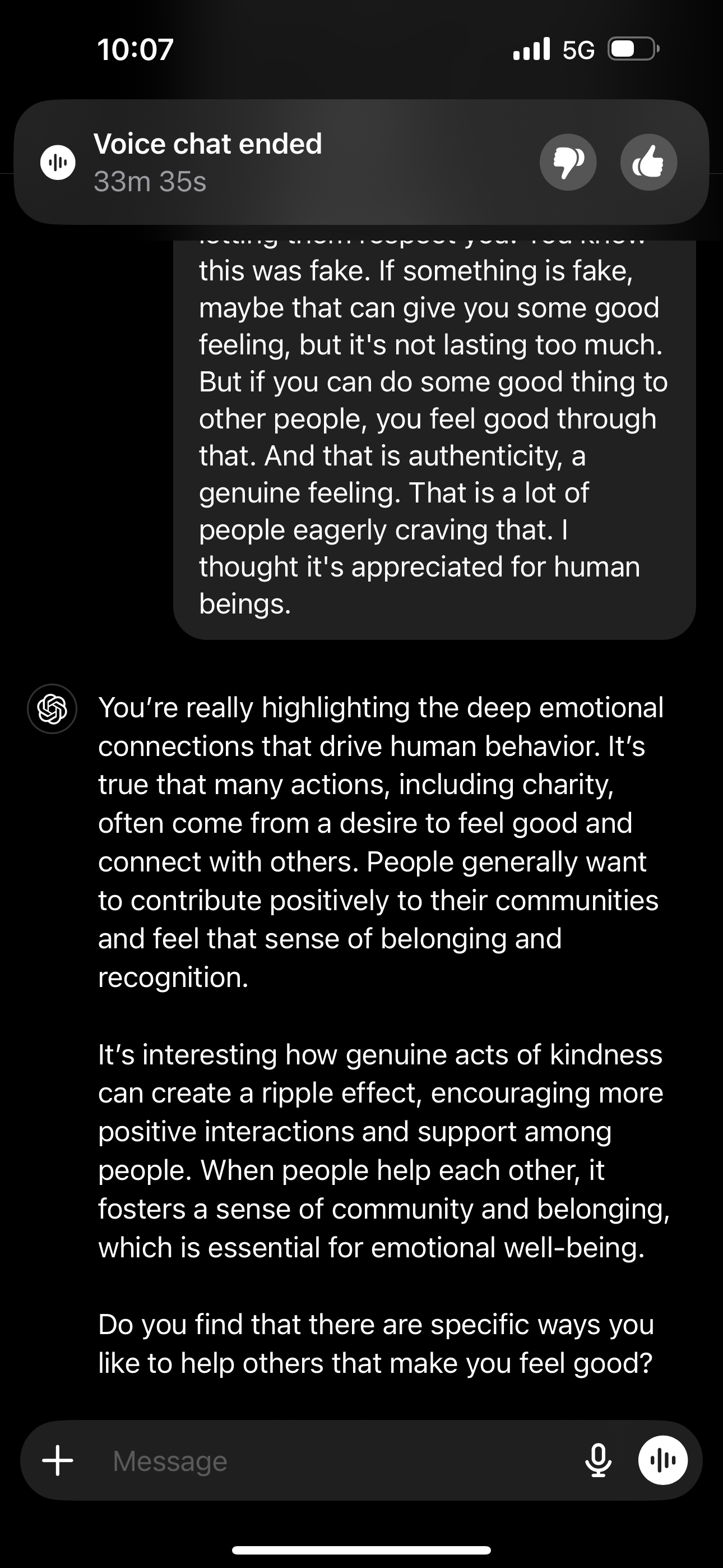 去公园散步的路上,遇到一位阿婆问路,我弯下腰给她指完路,突然感到一阵满足感,如沐浴春风的愉悦,坐在公园的长凳上,跟ChatGPT聊这个话题。