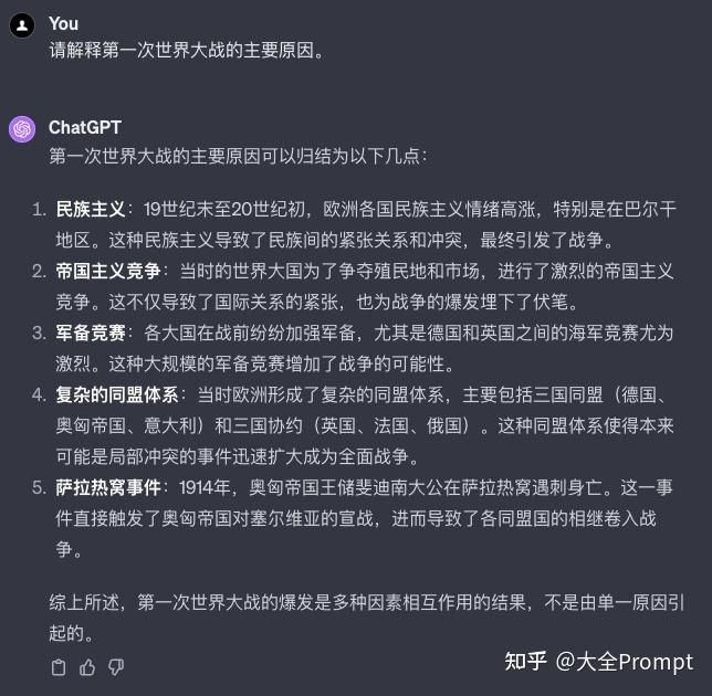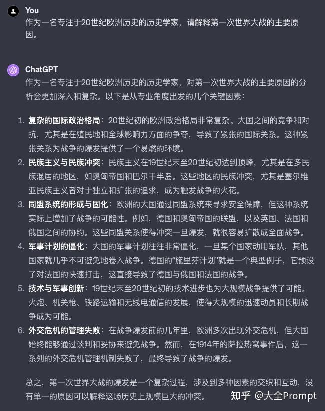 - 提问:“作为一名专注于20世纪欧洲历史的历史学家,请解释第一次世界大战的主要原因。”