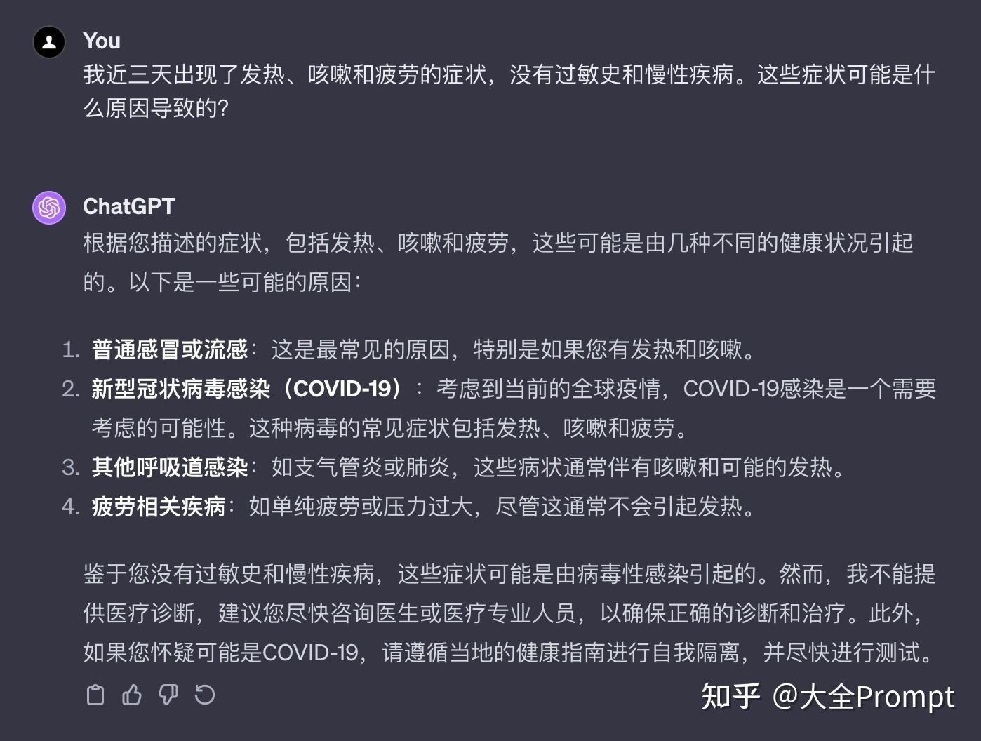 - 改进后的提问:“我近三天出现了发热、咳嗽和疲劳的症状,没有过敏史和慢性疾病。这些症状可能是什么原因导致的?”