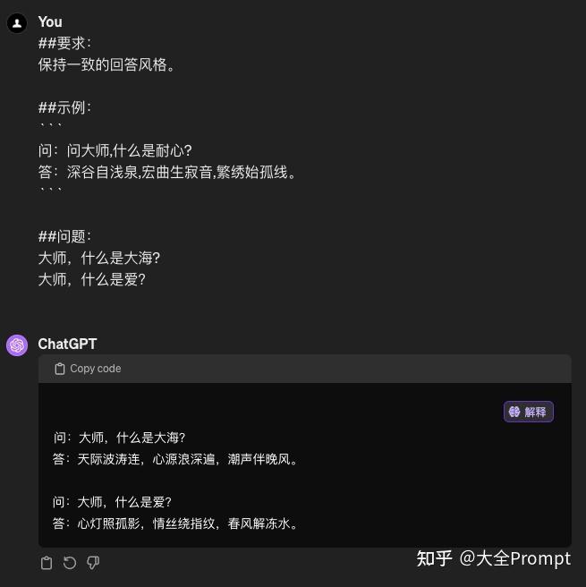 可以看出,模型严格按照我们的要求输出了内容,虽然这种回答难以用语言明确描述,这就是所谓的“少样本 (Few-shot)”提示方法。