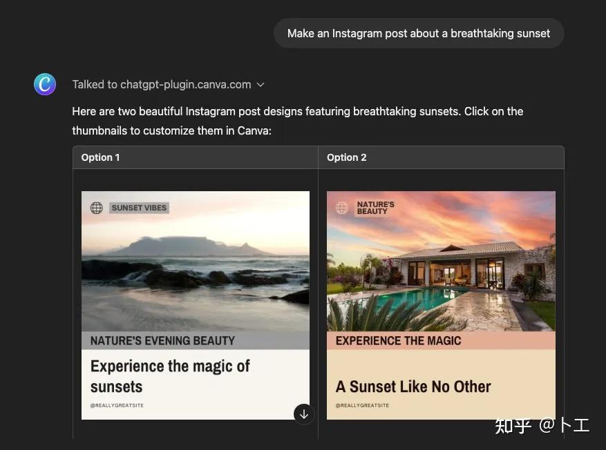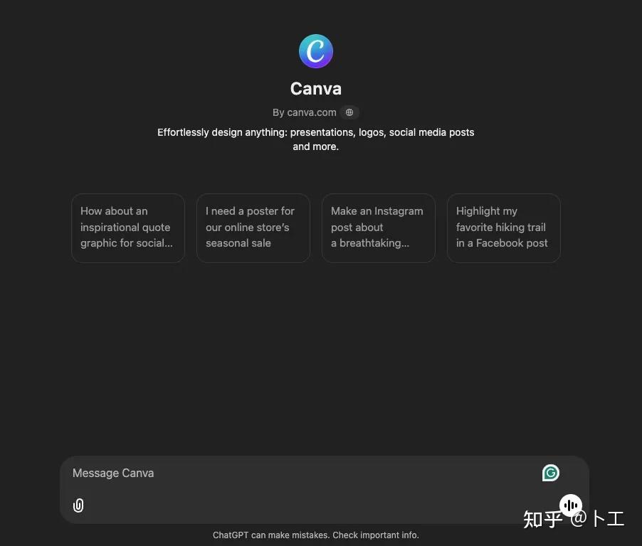 因为都在ChatGPT内创作,好处就是不用在各个平台间来回交换,只需要在ChatGPT中就可以实现无缝协作,比如生成的图片可以直接导入 Canva,添加文字、图标等元素,进一步优化设计等。