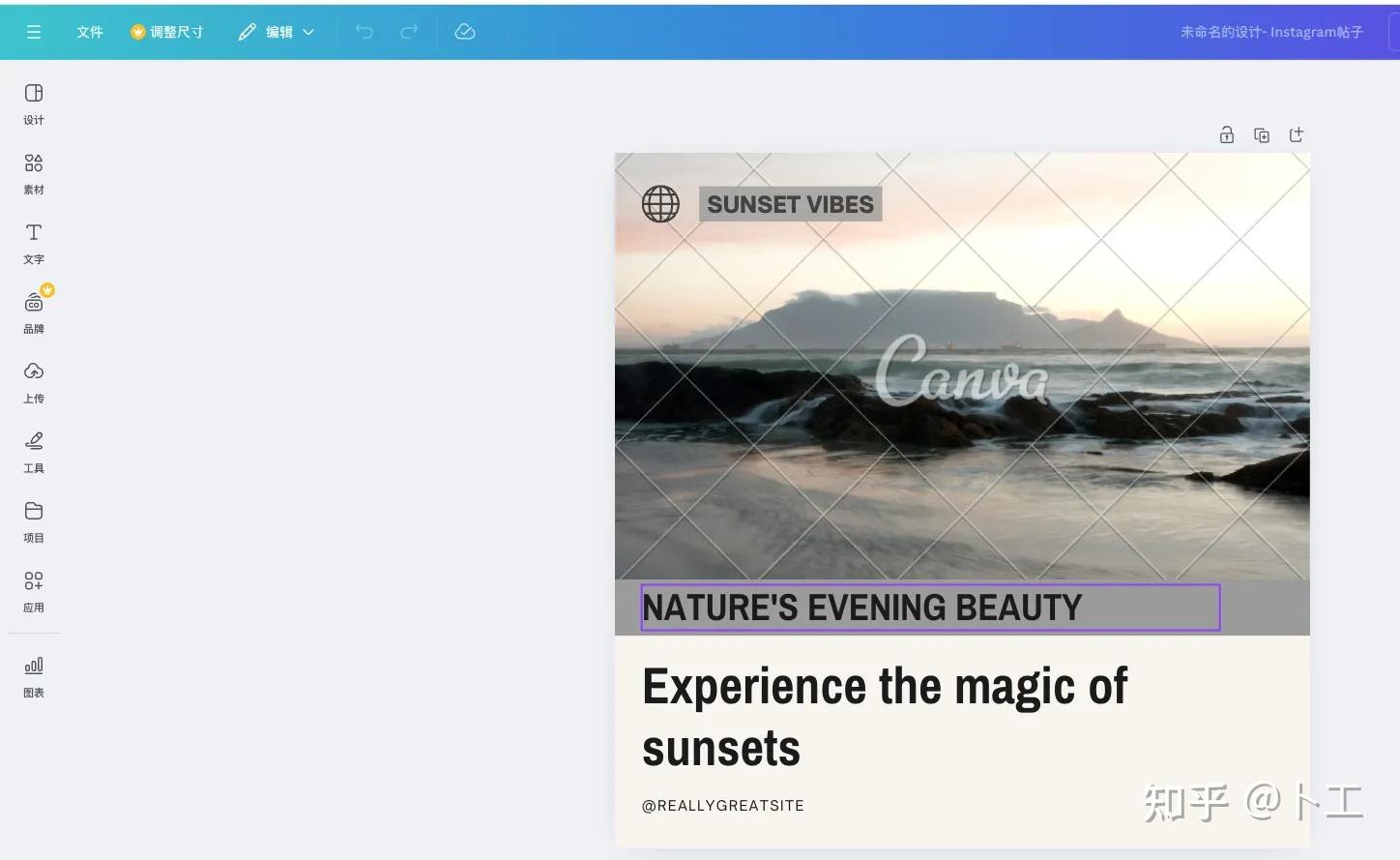 同样我们可以输入prompt,告知我们的需求,在众多idea中选择自己需要的图片,选中图片后点击,就会挑转到https://www.canva.cn/en/的编辑网页中进行更多的设计修改。