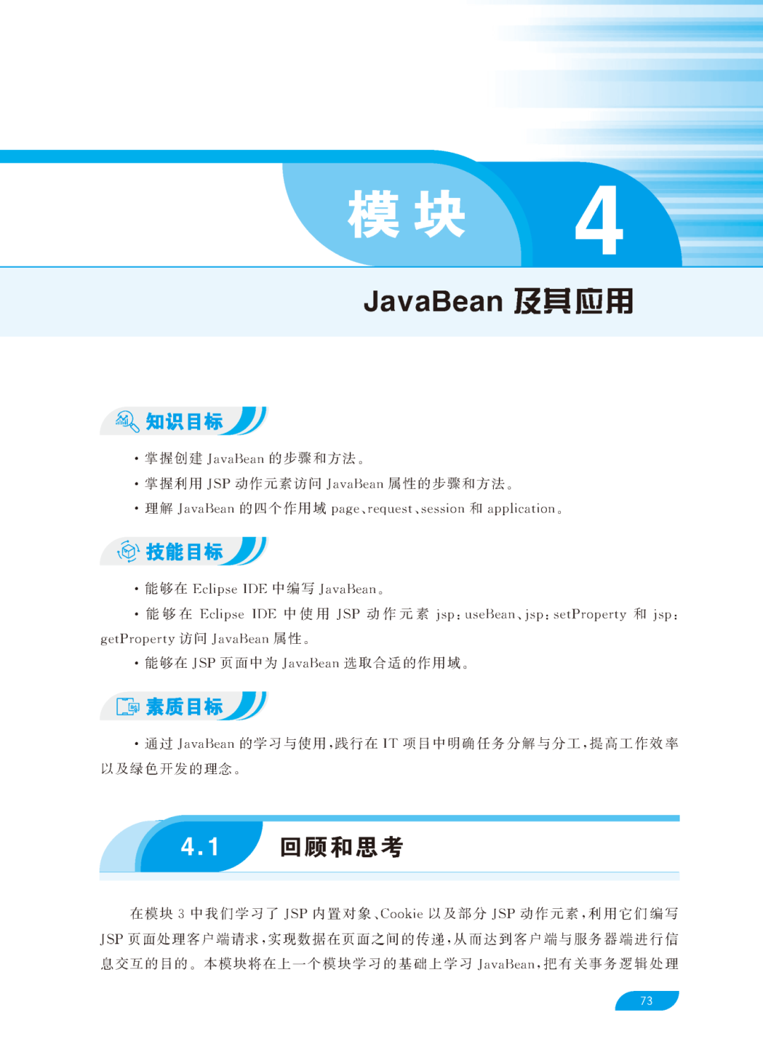 本书从Java Web应用开发技术的原理出发,详细介绍了进行Web应用开发所需的基础知识和基本技能。本书共分9个模块,涵盖了JSP运行环境搭建、JSP语法、JSP内置对象、JavaBean及其应用、Web前端脚本技术、Servlet技术、JSP数据库操作、Java Web安全应用等内容,最后一个部分是课程设计实例,帮助学生巩固所学知识和技能。