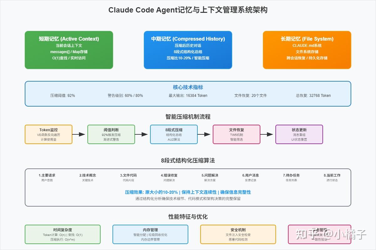 通过深度分析Claude Code的源码实现,该系统通过多层次的记忆存储(短期记忆管理当前回话上下文,中期记忆8段式压缩总结,压缩比20%,长期记忆保存在Claude.md文件,持久化存储)、、动态注入机制和状态持久化,实现了在有限上下文窗口中维持长时间对话的能力。