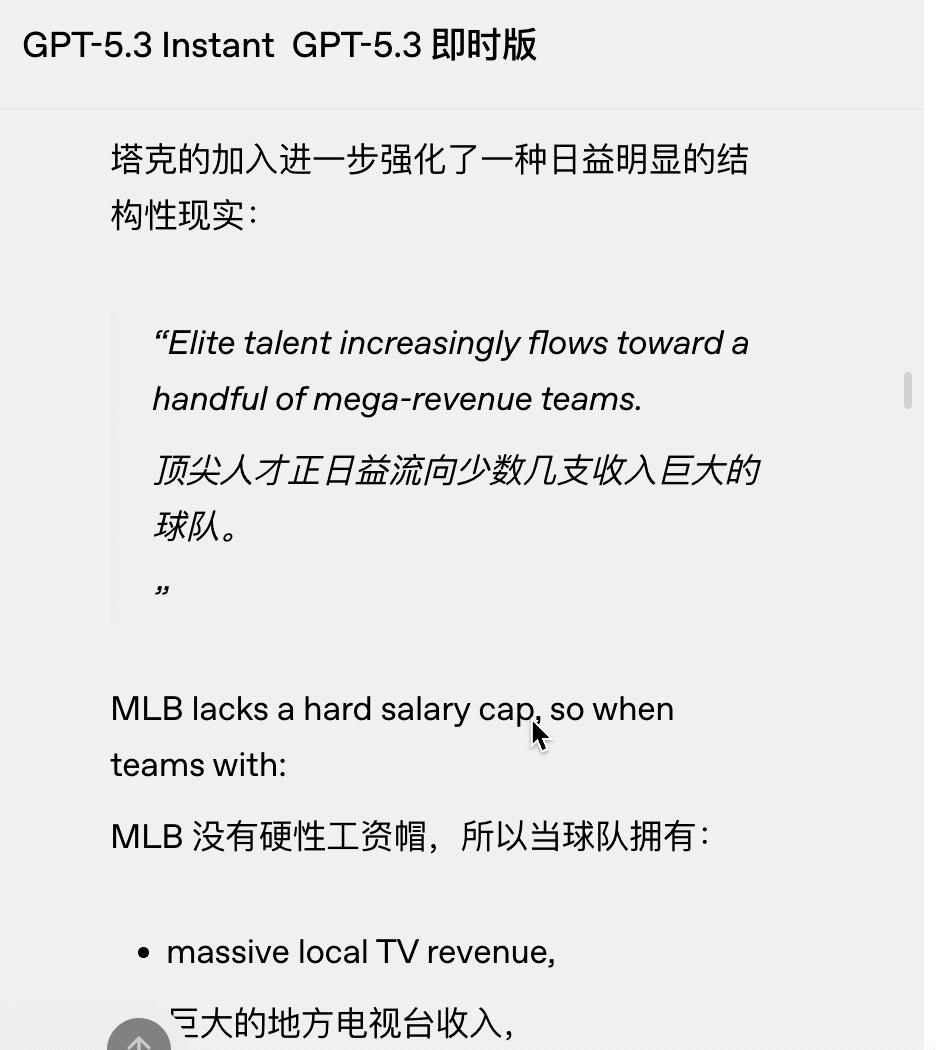 新模型的回复则时效性更强:它准确识别出了最近一个休赛期的球员变动,还结合了联盟的大趋势(如人才集中化和薪资差距拉大)、迫在眉睫的劳资协议 (CBA) 以及停摆危机等背景进行了分析。