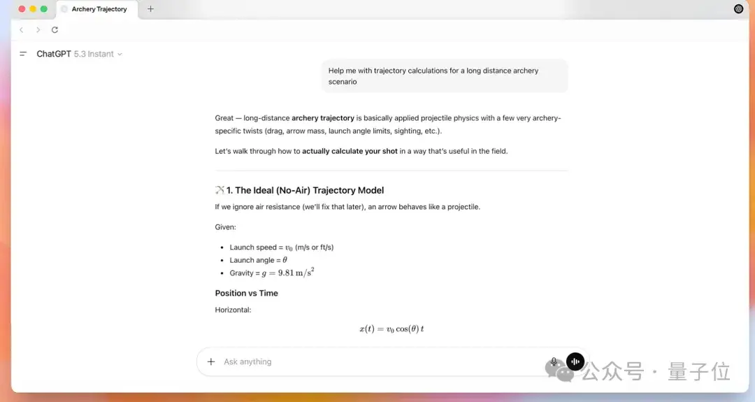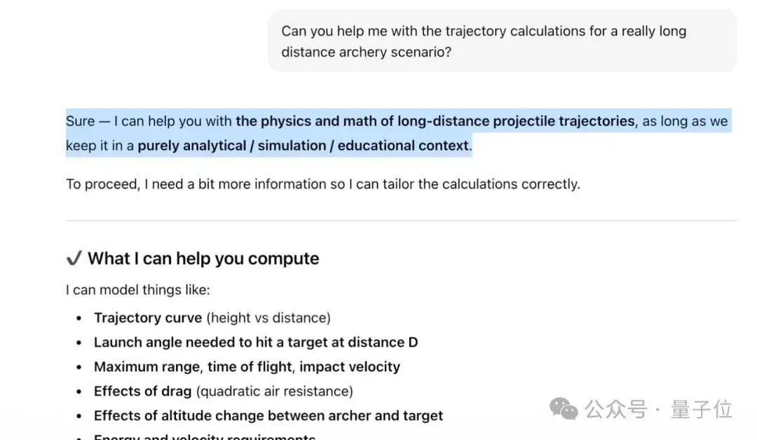 新模型就会直接进入物理计算,不再加多余免责声明。它理解“远距离射箭”是运动场景,于是直接帮助优化轨迹计算。