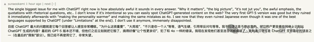 包括也有不少网友吐槽,ChatGPT的回答生硬的铺垫太多,比如“为什么这很重要”“大局观”“不只是你一个人”等等。