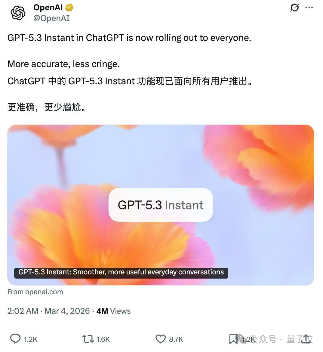 3月4日凌晨,谷歌前脚刚发完Gemini 3.1 Flash-Lite,OpenAI后脚就更新了GPT-5.3 Instant。