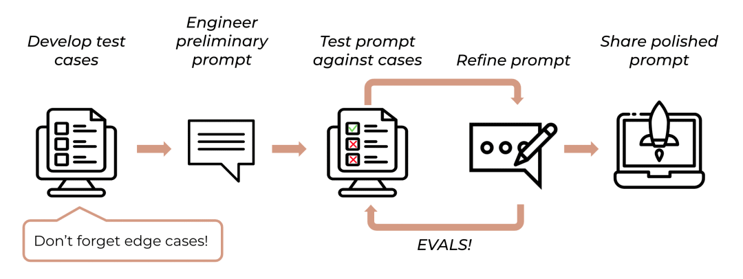我们建议采用一种基于测试来驱动的开发原则,以确保prompt能发挥出**效能。具体如下图: