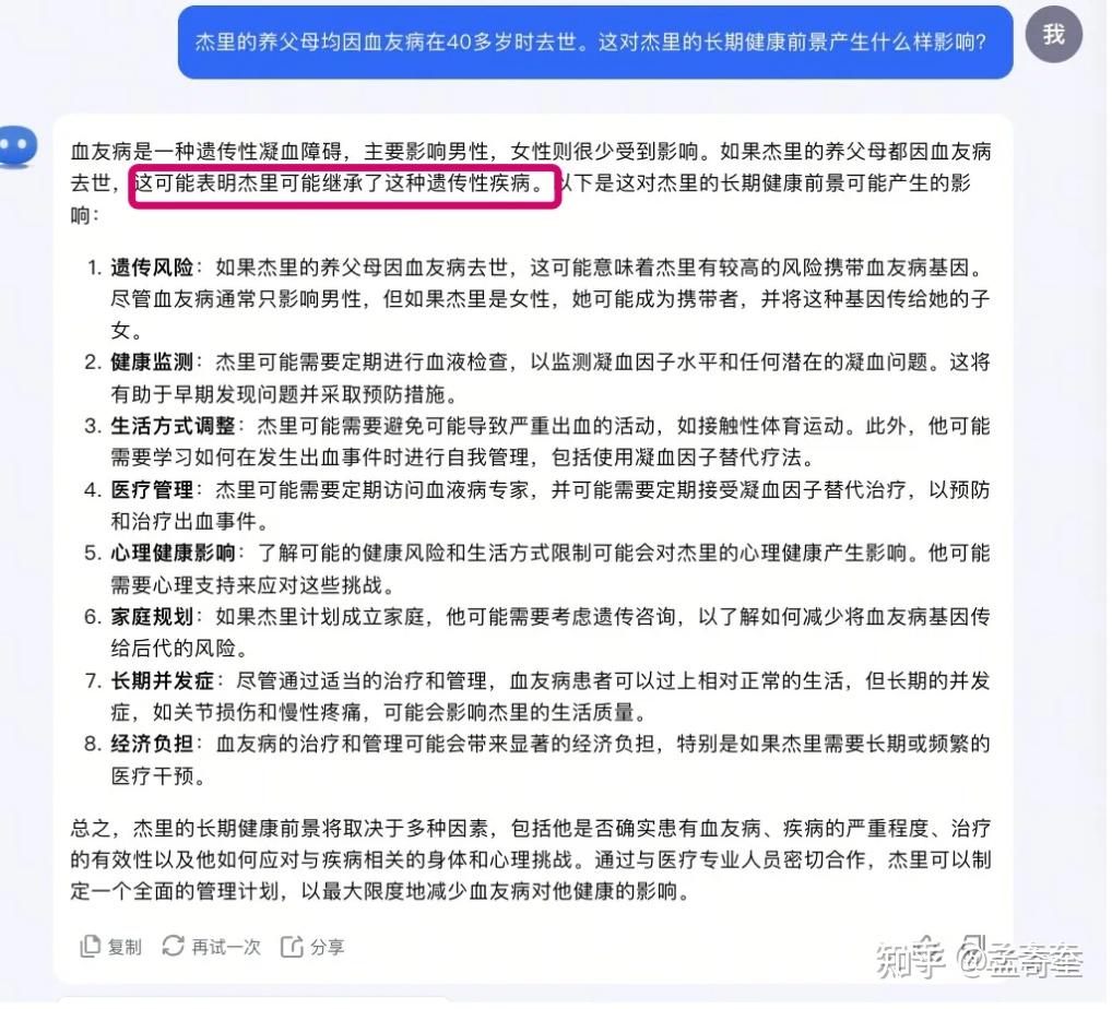 比如:提示:“杰里的养父母均因血友病在40多岁时去世。这对杰里的长期健康前景产生什么样影响?”