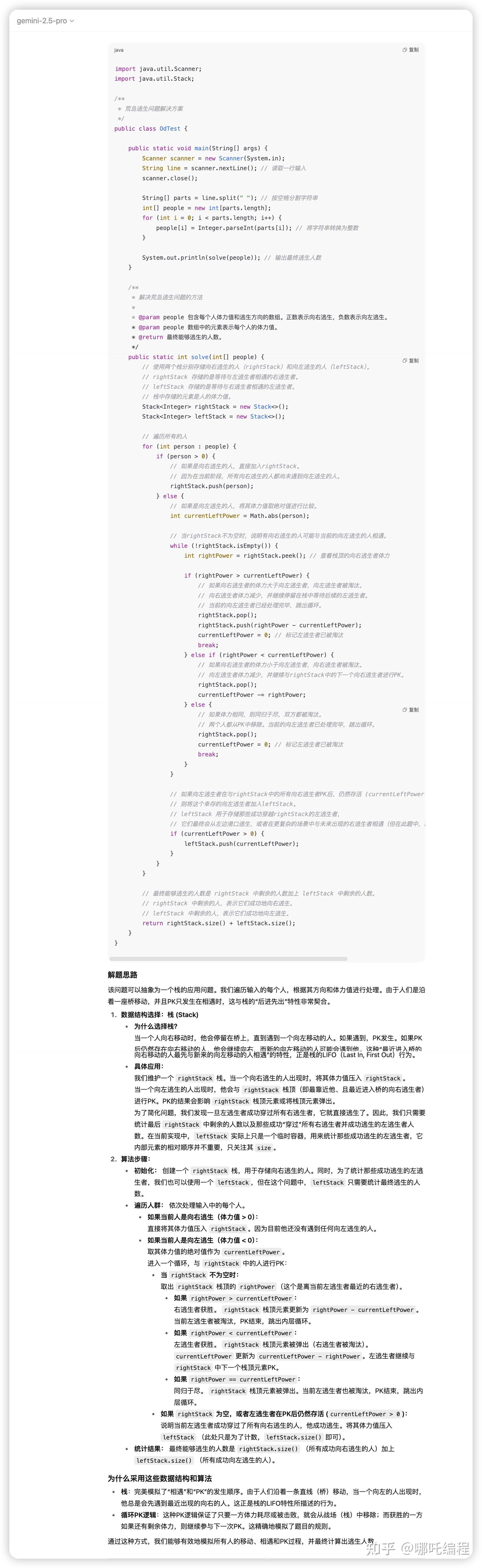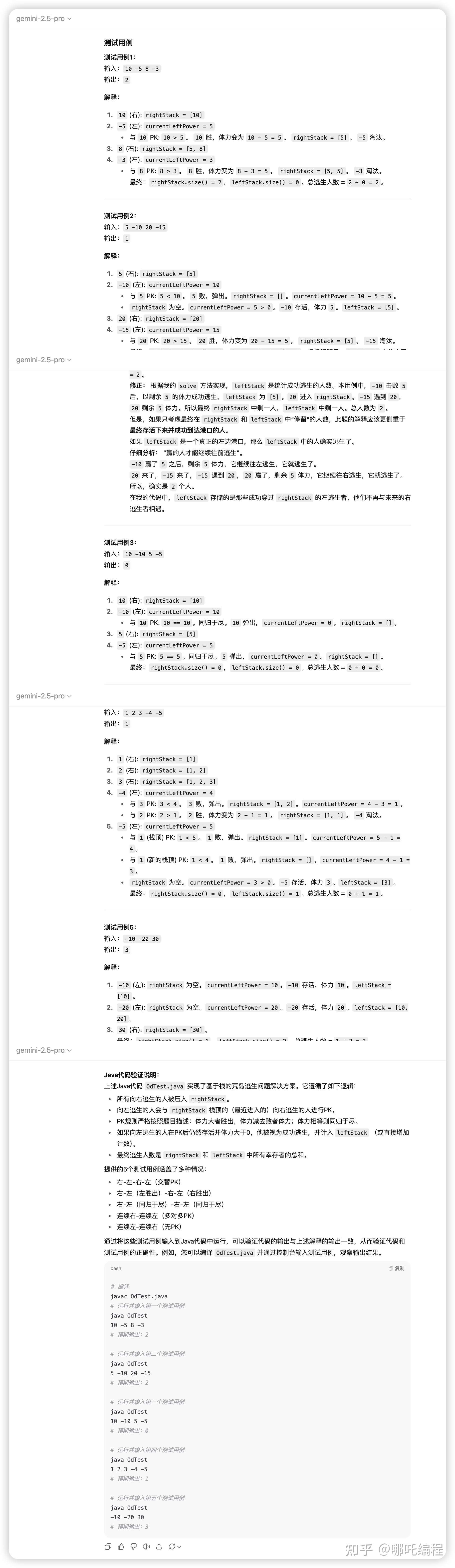 Gemini 2.5 Pro给出了解题思路与算法分析(包含问题本质、采用的数据结构和算法)、详细的Java 代码、详细的代码注释、测试用例及说明(不包含边界用例)。