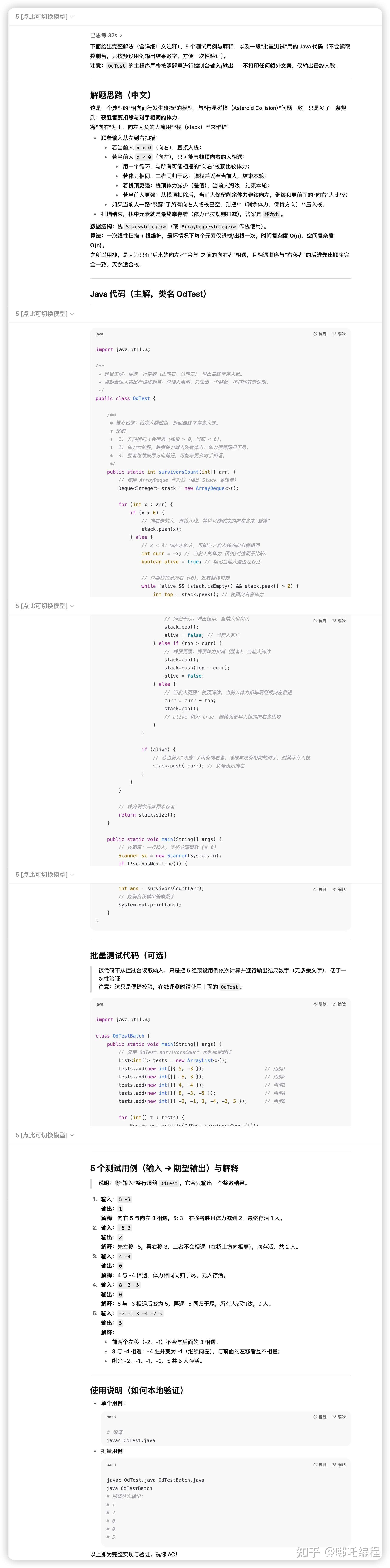 GPT-5给出了解题思路、算法步骤、详细的Java 代码、详细的代码注释、对Java代码进行自测、测试用例及说明(不包含边界用例)。