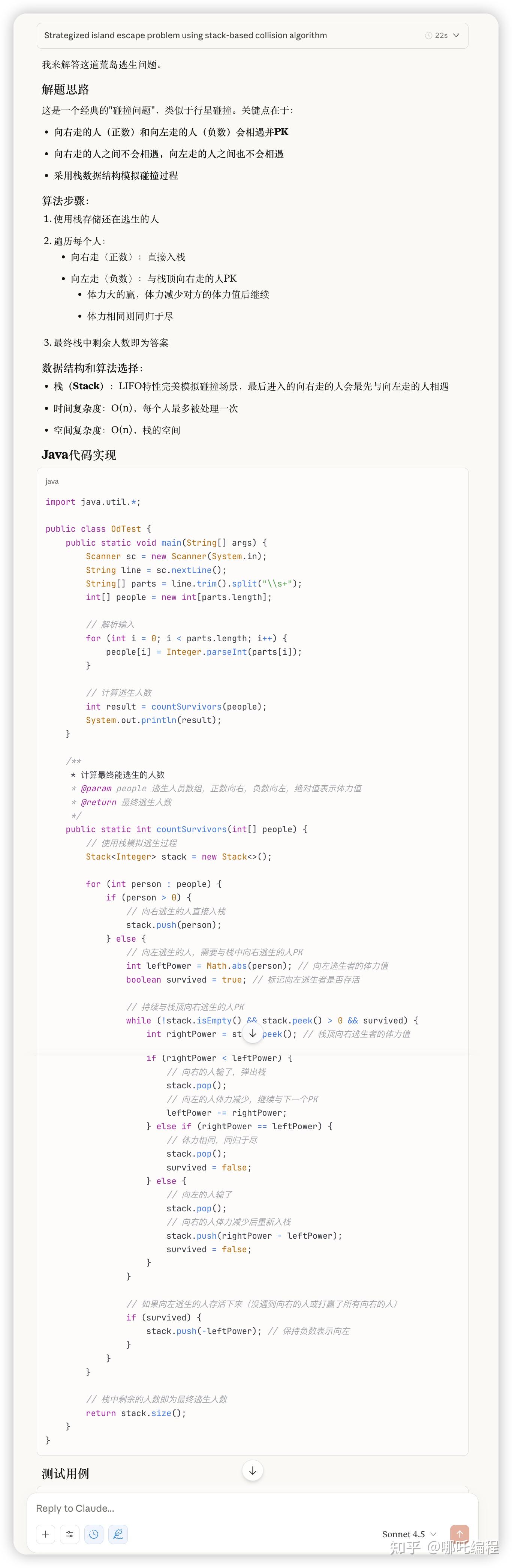 Claude Sonnet 4.5给出了解题思路与算法分析(包含问题本质、采用的数据结构和算法)、详细的Java 代码、详细的代码注释、测试用例及说明(不包含边界用例)。