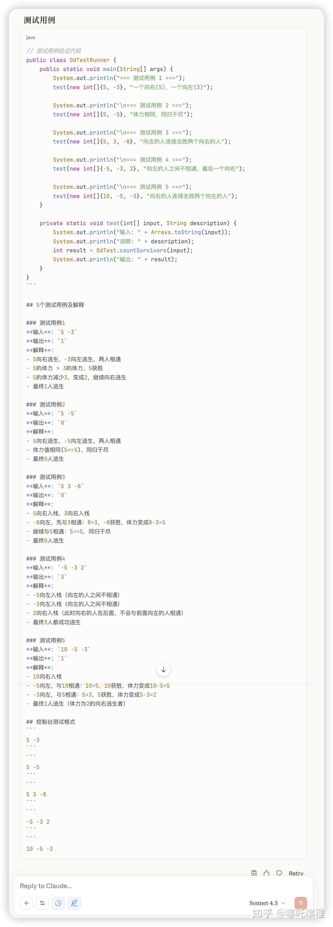 2、Claude Sonnet 4.5作为Anthropic的最新旗舰模型,表现亮眼,但未给出边界测试用例,屈居第二。