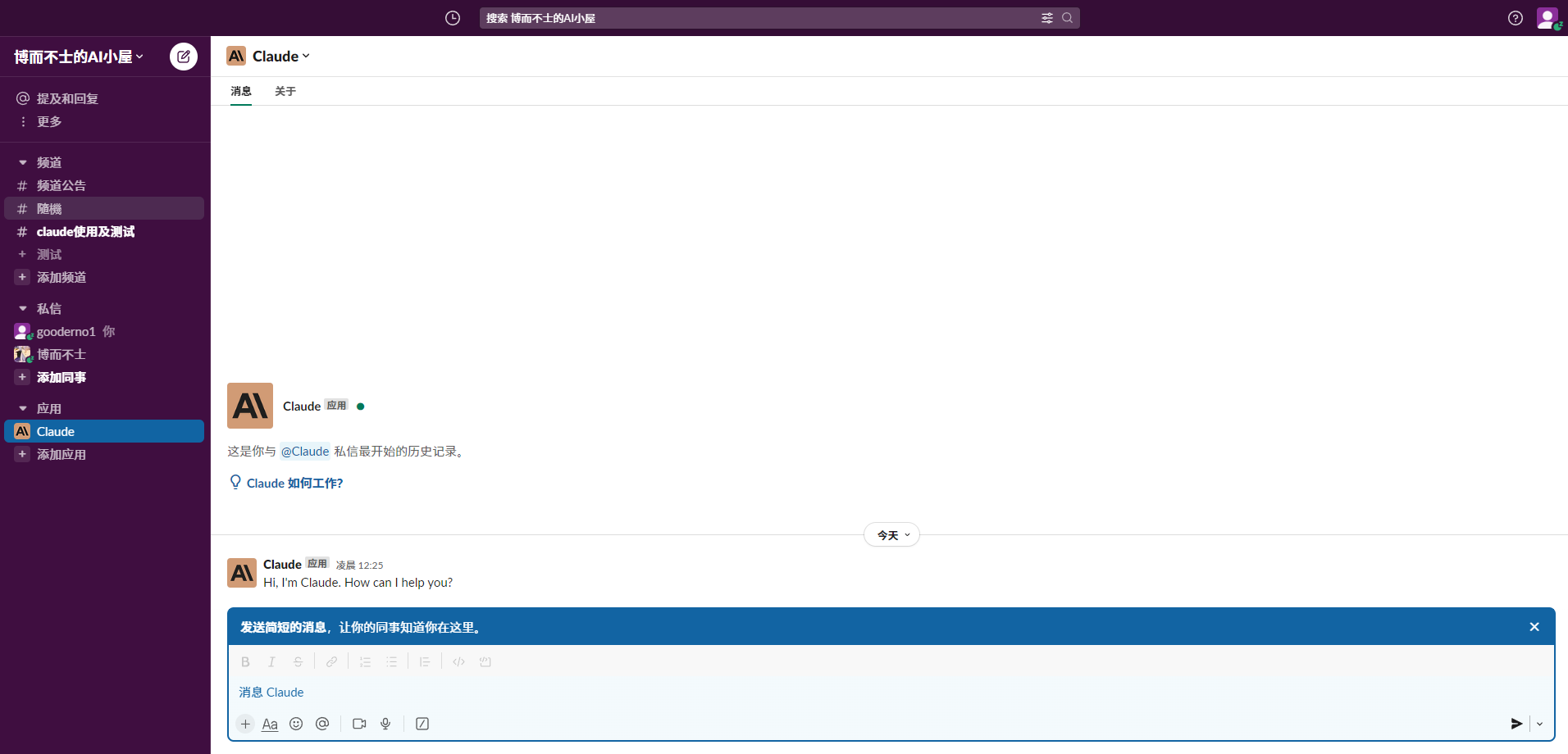 然后进入这个界面就说明加入成功啦!点击应用下面的 Claude 私聊,或者在 Claude使用及测试 群里和大家一起使用。