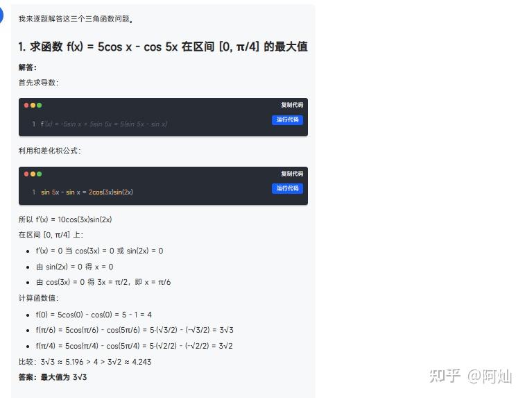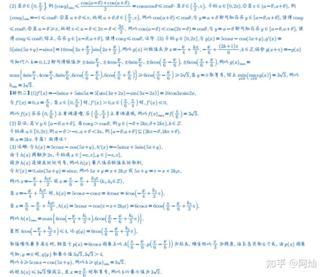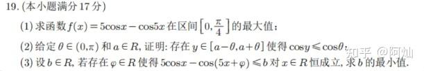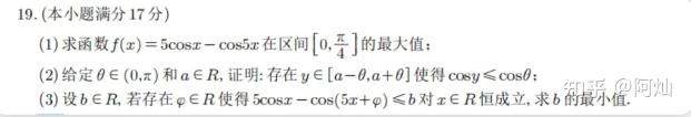 19.(本小题满分 17 分)1. 求函数 ( f(x) = 5\cos x - \cos 5x ) 在区间 ([0, \frac{\pi}{4}]) 的最大值;2. 给定 ( \theta \in (0, \pi) ) 和 ( a \in \mathbb{R} ),证明:存在 ( y \in [a - \theta, a + \theta] ) 使得 ( \cos y \leq \cos \theta );3. 设 ( b \in \mathbb{R} ),若存在 ( \varphi \in \mathbb{R} ) 使得 ( 5\cos x - \cos(5x + \varphi) \leq b ) 对 ( x \in \mathbb{R} ) 恒成立,求 ( b ) 的最小值。