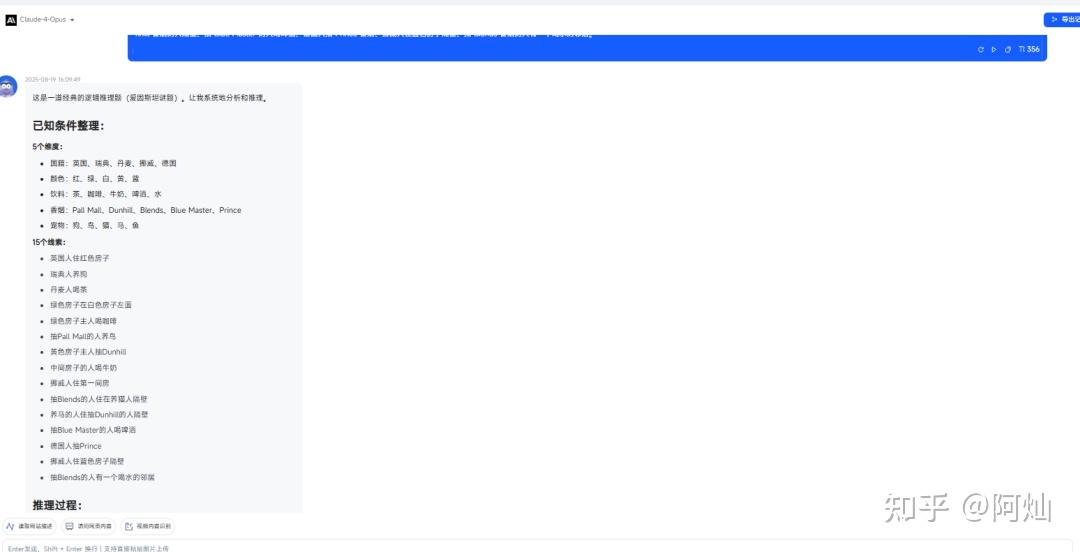 在本次测评中,我们选用了著名的“爱因斯坦斑马难题”来检验 Claude 4 的逻辑推理能力。结果显示,它展现出近似人类的高度推理智慧。
